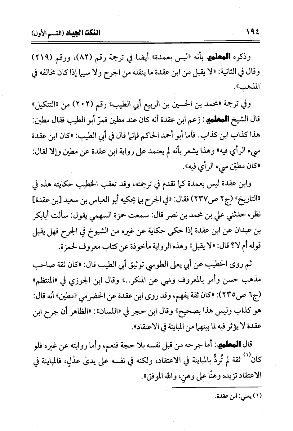 وذكره المعلمي بأنه "ليس بعمدة" أيضًا في ترجمة رقم (82)، ورقم (219) وقال في الثانية: "لا يقبل من ابن عقدة ما ينقله من الجرح ولا سيما إذا كان مخالفه في المذهب".