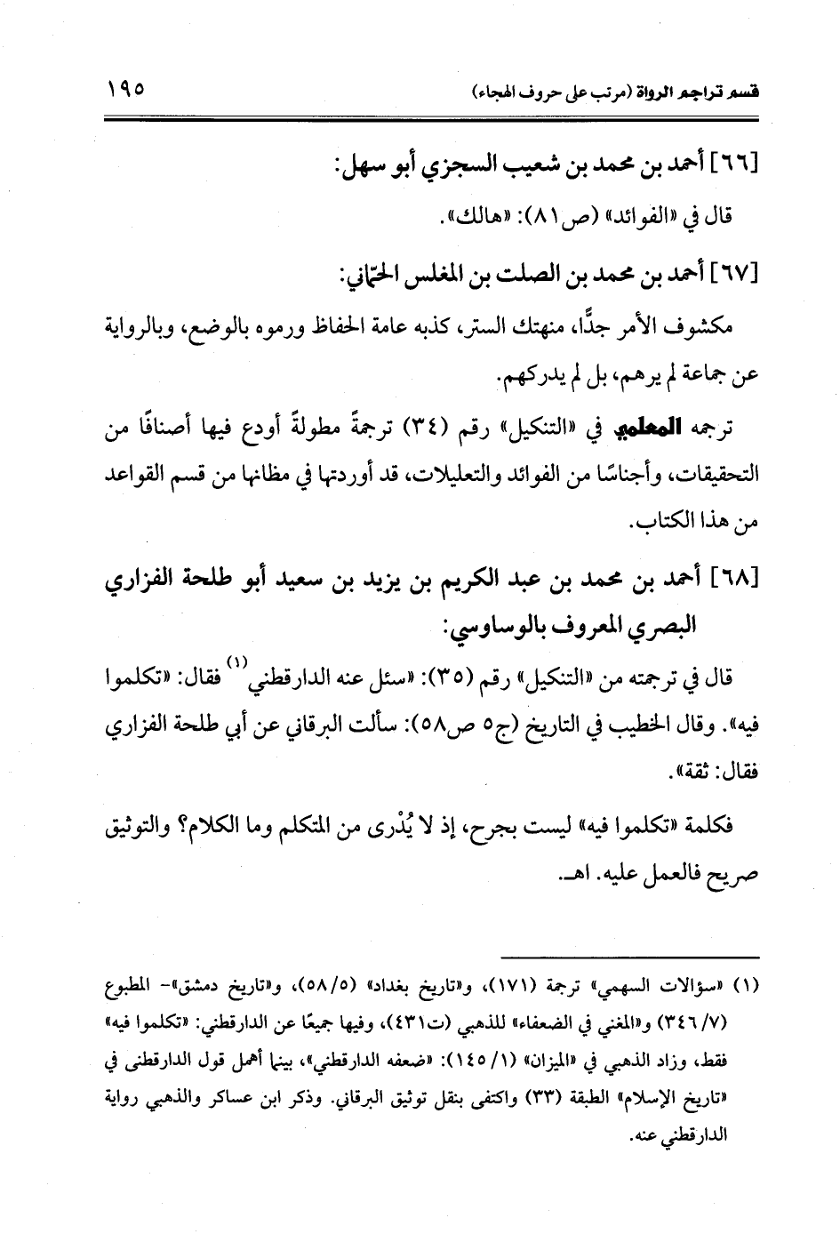 ترجمه المعلمي في "التنكيل" رقم (34) ترجمة مطولة أودع فيها أصنافًا من التحقيقات، وأجناسًا من الفوائد والتعليلات، قد أوردتها في مظانها من قسم القواعد من هذا الكتاب.