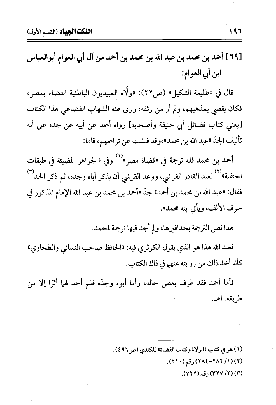 قال في "طليعة التنكيل" (ص 22): "ولَّاه العبيديون الباطنية القضاء بمصر، فكان يقضي بمذهبهم، ولم أر من وثقه، روى عنه الشهاب القضاعي هذا الكتاب [يعني كتاب فضائل أبي حنيفة وأصحابه] رواه أحمد عن أبيه عن جده على أنه تأليف الجدّ "عبد الله بن محمد"، وقد فتشت عن تراجمهم، فأما:
