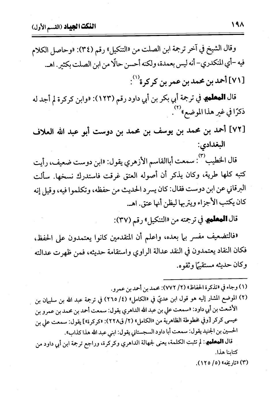 وقال الشيخ في آخر ترجمة ابن الصلت من "التنكيل" رقم (34): "وحاصل الكلام فيه -أي المنكدري- أنه ليس بعمدة، ولكنه أحسن حالًا من ابن الصلت بكثير. اهـ.