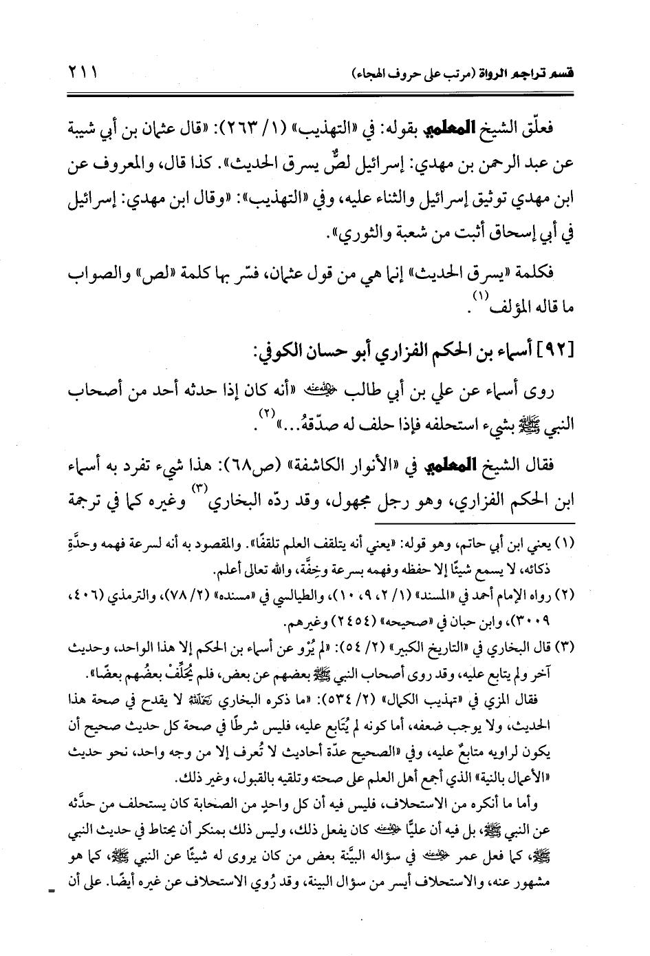 فعلّق الشيخ المعلمي. بقوله: في "التهذيب" (1/ 263): "قال عثمان بن أبي شيبة عن عبد الرحمن بن مهدي: إسرائيل لصٌّ يسرق الحديث". كذا قال، والمعروف عن ابن مهدي توثيق إسرائيل والثناء عليه، وفي "التهذيب": "وقال ابن مهدي: إسرائيل في أبي إسحاق أثبت من شعبة والثوري".