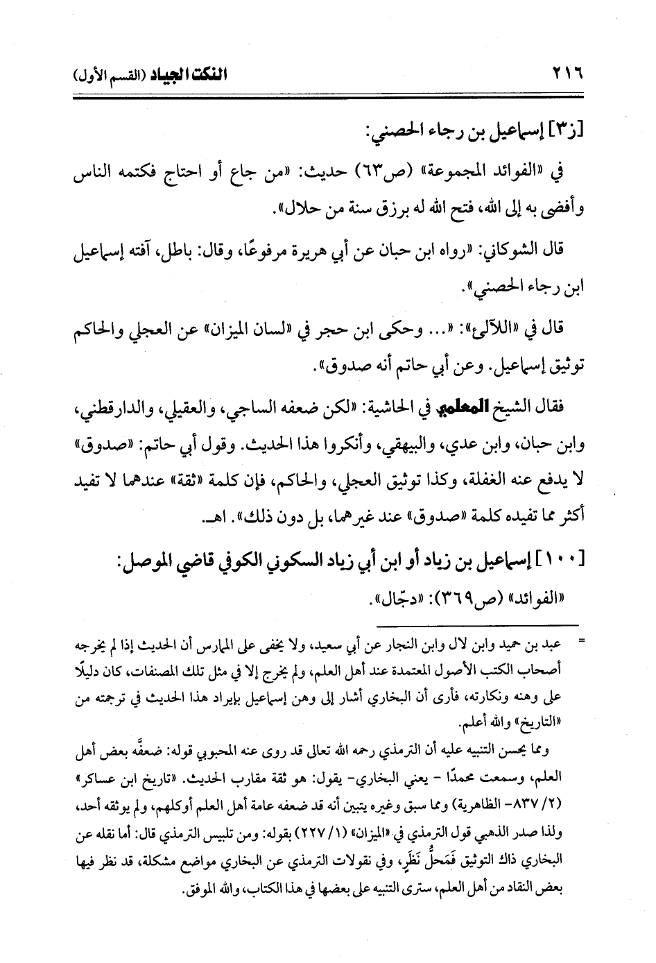 فقال الشيخ المعلمي في الحاشية: "لكن ضعفه الساجي، والعقيلي، والدارقطني، وابن حبان، وابن عدي، والبيهقي، وأنكروا هذا الحديث. وقول أبي حاتم: "صدوق" لا يدفع عنه الغفلة، وكذا توثيق العجلي، والحاكم، فإن كلمة "ثقة" عندهما لا تفيد أكثر مما تفيده كلمة "صدوق" عند غيرهما، بل دون ذلك". اهـ. .