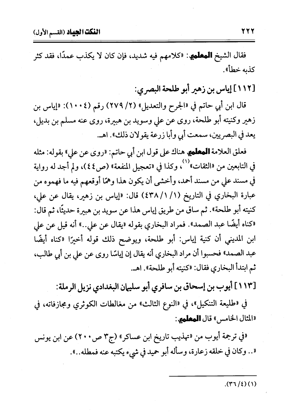 فعلق العلامة المعلمي هناك على قول ابن أبي حاتم: "روى عن علي" بقوله: مثله في التابعين من "الثقات" (¬1)، وكذا في "تعجيل المنفعة" (ص 44)، ولم أجد له رواية في مسند علي من مسند أحمد، وأخشى أن يكون هذا وهمًا أوقعهم فيه ما فهموه من عبارة البخاري في التاريخ (1/ 1 / 438) قال: "إياس بن زهير، يقال عن علي، كنيته أبو طلحة". ثم ساق من طريق إياس هذا عن سويد بن هبيرة حديثًا، ثم قال: "كناه أيضًا عبد الصمد". فمراد البخاري بقوله "يقال عن علي .. " أنه قيل عن علي ابن المديني أن كنية إياس: أبو طلحة، ويوضح ذلك قوله أخيرًا "كناه أيضًا عبد الصمد" فحسبوا أن مراد البخاري أنه يقال إن إياسًا روى عن علي بن أبي طالب، ثم ابتدأ البخاري فقال: "كنيته أبو طلحة". اهـ.