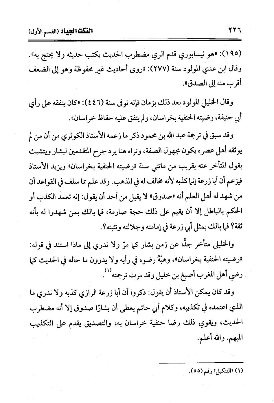 وقد كان يمكن الأستاذ أن يقول: ذكروا أن أبا زرعة الرازي كذبه ولا ندري ما الذي اعتمده في تكذيبه، وكلام أبي حاتم يعطى أن بشارًا صدوق إلا أنه مضطرب الحديث، ويقوي ذلك رضا حنفية خراسان به، والتصديق يقدم على التكذيب المبهم. والله أعلم.