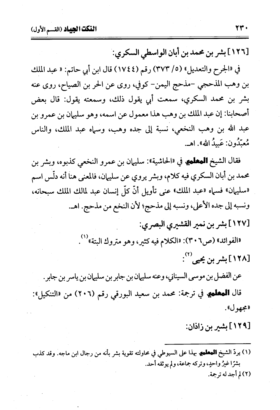 (¬1) يردّ الشيخ المعلمي بهذا على السيوطي في محاولته تقوية بشر بأنه من رجال ابن ماجه. وقد كذب بشرًا غيرُ واحدٍ، وتركه جماعة، ولم يوثقه أحد.