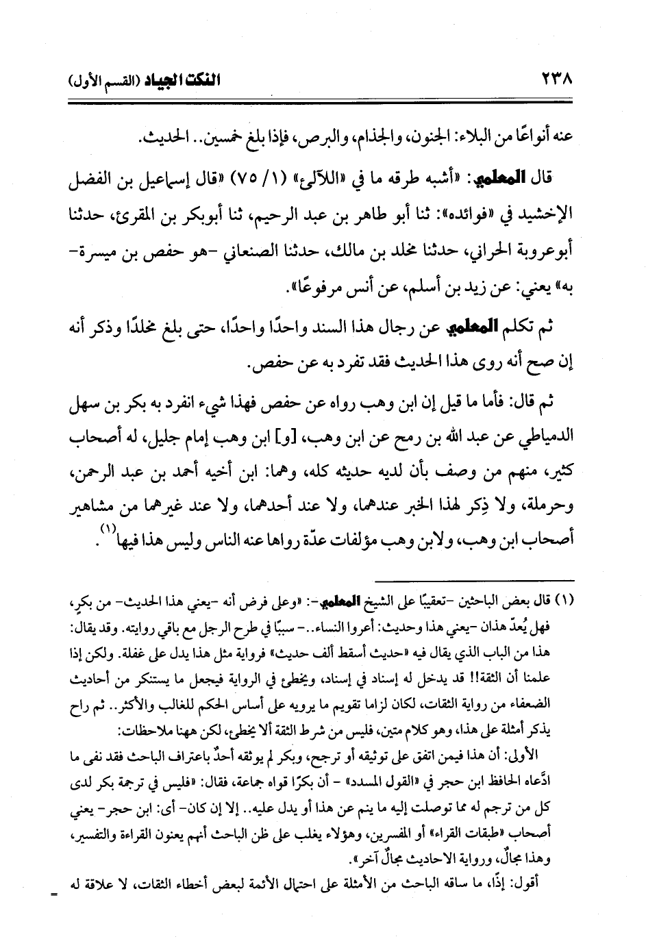 (¬1) قال بعض الباحثين -تعقيبًا على الشيخ للمعلمي-: "وعلي فرض أنه -يعني هذا الحديث- من بكرٍ، فهل يُعدّ هذان -يعني هذا وحديث: أعروا النساء .. - سببًا في طرح الرجل مع باقي روايته. وقد يقال: هذا من الباب الذي يقال فيه "حديث أسقط ألف حديث" فرواية مثل هذا يدل على غفلة. ولكن إذا علمنا أن الثقة!! قد يدخل له إسناد في إسناد، ويخطىء في الرواية فيجعل ما يستنكر من أحاديث الضعفاء من رواية الثقات لكان لزامًا تقويم ما يرويه على أساس الحكم للغالب والأكثر .. ثم راح يذكر أمثلة على هذا، وهو كلام متين، فليس من شرط الثقة ألا يخطىء، لكن هاهنا ملاحظات: