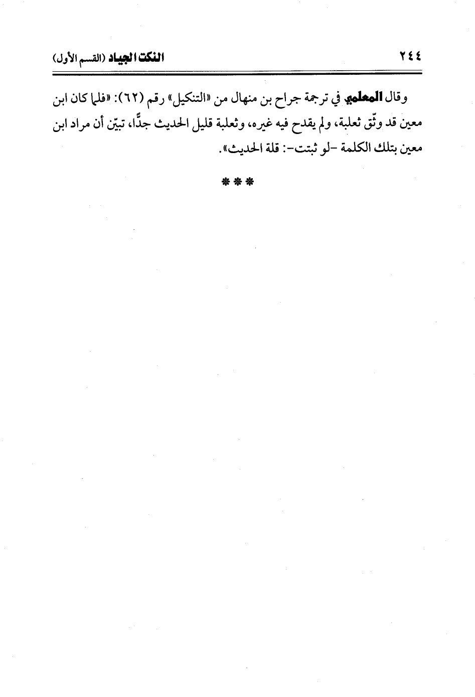 وقال المعلمي في ترجمة جراح بن منهال من "التنكيل" رقم (62): "فلما كان ابن معين قد وثّق ثعلبة، ولم يقدح فيه غيره، وثعلبة قليل الحديث جدًّا، تبّين أن مراد ابن معين بتلك الكلمة -لو ثبتت-: قلة الحديث".
