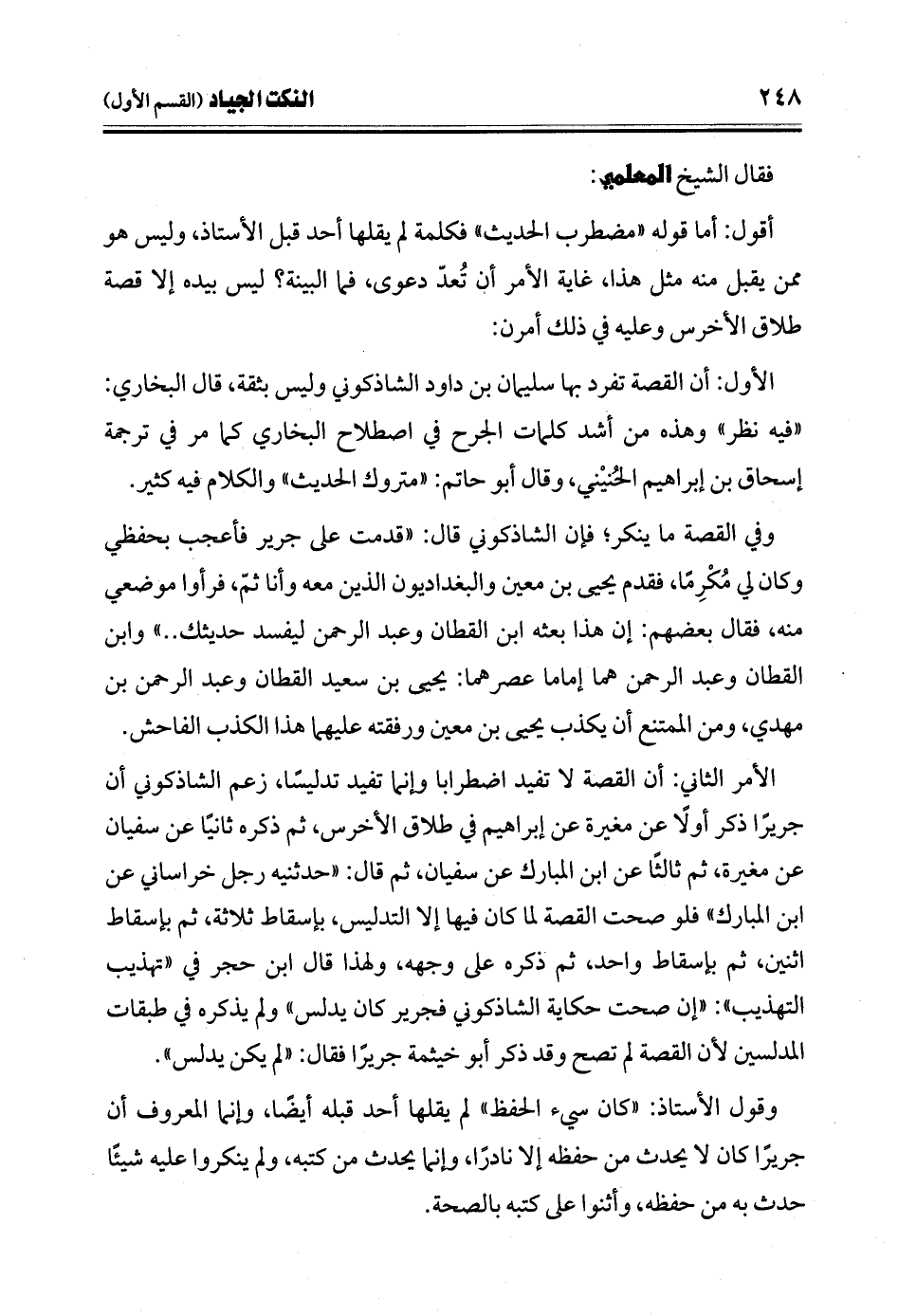 الأمر الثاني: أن القصة لا تفيد اضطرابًا وإنما تفيد تدليسًا، زعم الشاذكوني أن جريرًا ذكر أولًا عن مغيرة عن إبراهيم في طلاق الأخرس، ثم ذكره ثانيًا عن سفيان عن مغيرة، ثم ثالثًا عن ابن المبارك عن سفيان، ثم قال: "حدثنيه رجل خراساني عن ابن المبارك" فلو صحت القصة لما كان فيها إلا التدليس، بإسقاط ثلاثة، ثم بإسقاط اثنين، ثم بإسقاط واحد، ثم ذكره على وجهه، ولهذا قال ابن حجر في "تهذيب التهذيب": "إن صحت حكاية الشاذكوني فجرير كان يدلس" ولم يذكره في طبقات المدلسين لأن القصة لم تصح وقد ذكر أبو خيثمة جريرًا فقال: "لم يكن يدلس".