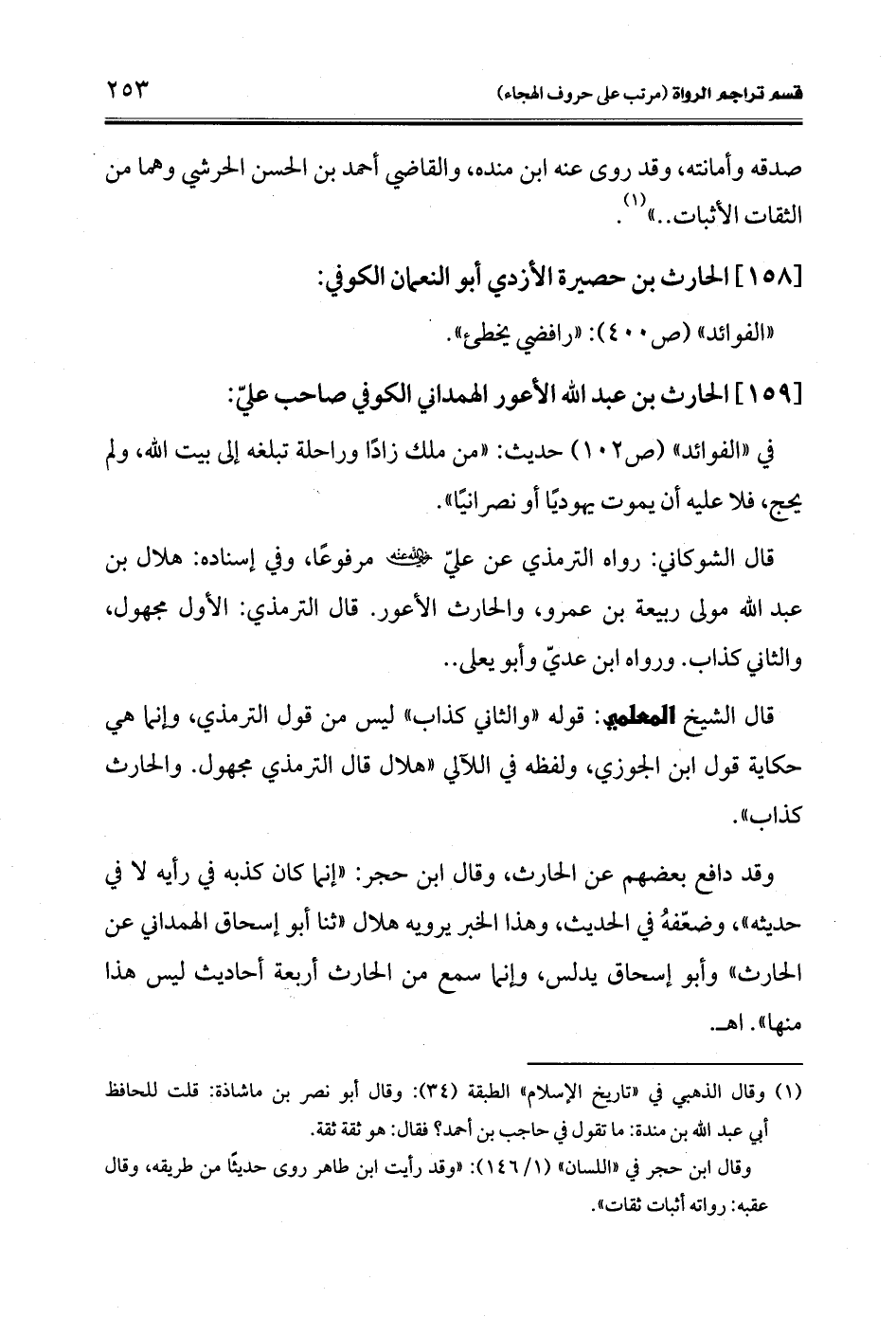قال الشيخ المعلمي: قوله "والثاني كذاب" ليس من قول الترمذي، وإنما هي حكاية قول ابن الجوزي، ولفظه في اللآلي "هلال قال الترمذي مجهول. والحارث كذاب".