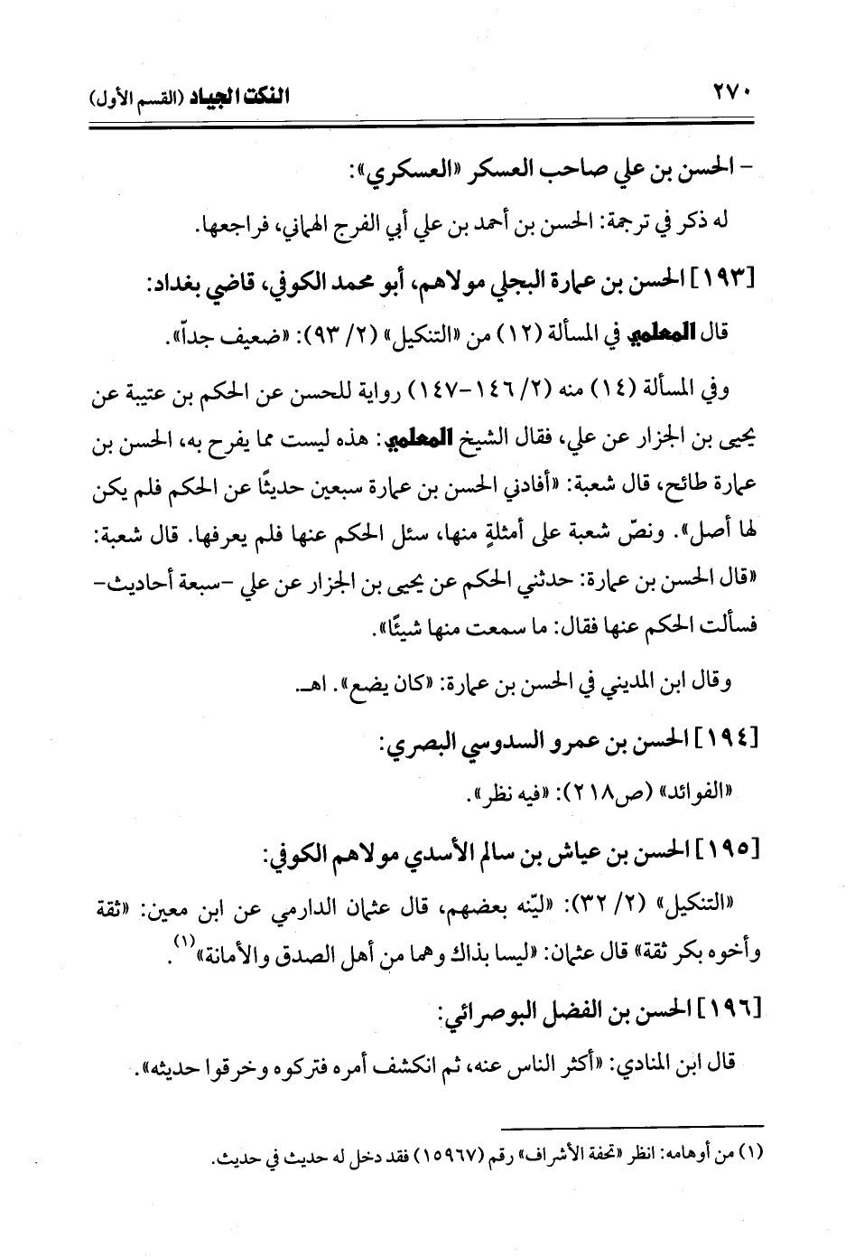وفي المسألة (14) منه (2/ 146 - 147) رواية للحسن عن الحكم بن عتيبة عن يحيى بن الجزار عن علي، فقال الشيخ المعلمي: هذه ليست مما يفرح به، الحسن بن عمارة طائح، قال شعبة: "أفادني الحسن بن عمارة سبعين حديثًا عن الحكم فلم يكن لها أصل". ونصّ شعبة على أمثلةٍ منها، سئل الحكم عنها فلم يعرفها. قال شعبة: "قال الحسن بن عمارة: حدثني الحكم عن يحيى بن الجزار عن علي -سبعة أحاديث- فسألت الحكم عنها فقال: ما سمعت منها شيئًا".