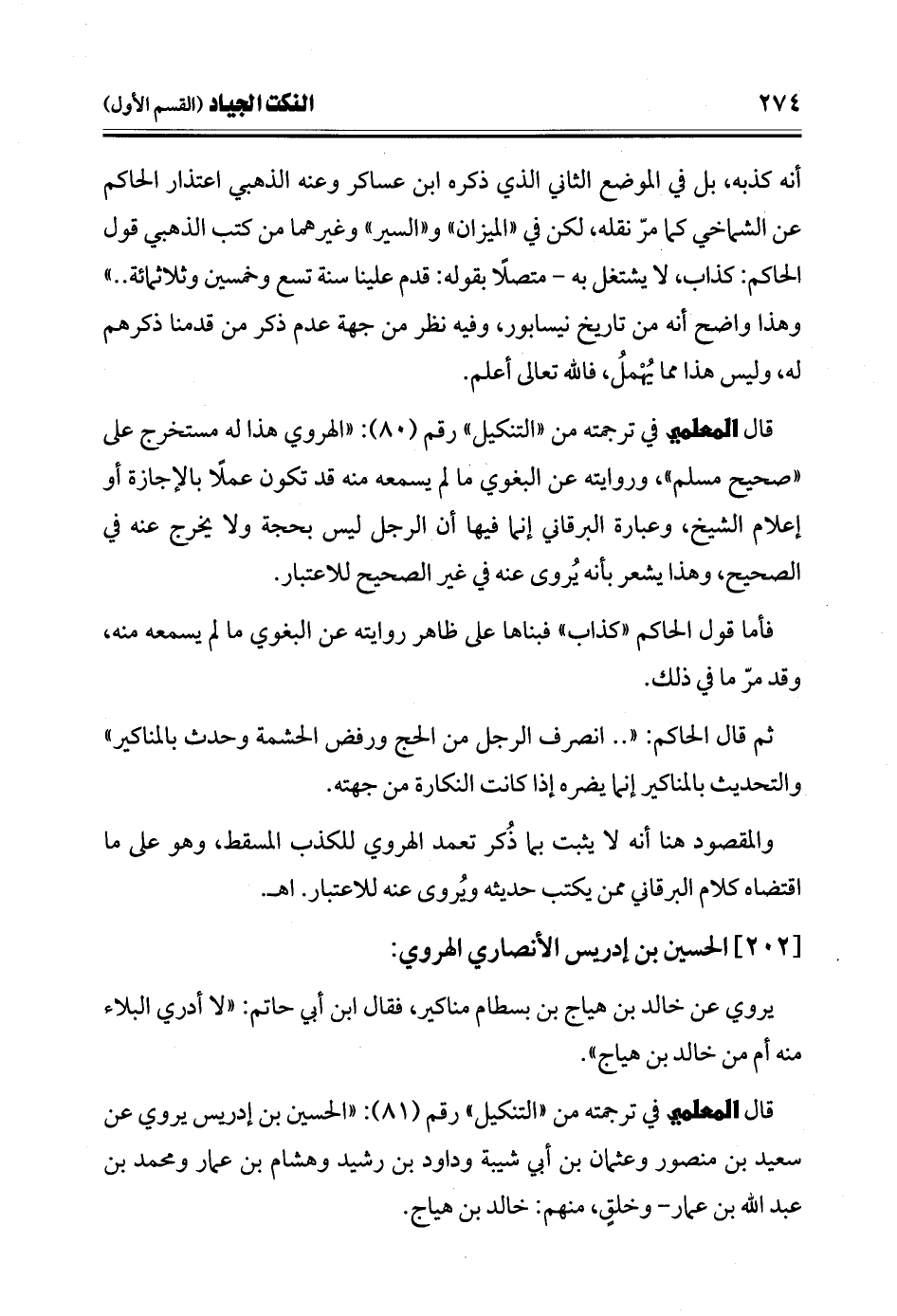 قال المعلمي في ترجمته من "التنكيل" رقم (80): "الهروي هذا له مستخرج على "صحيح مسلم"، وروايته عن البغوي ما لم يسمعه منه قد تكون عملًا بالإجازة أو إعلام الشيخ، وعبارة البرقاني إنما فيها أن الرجل ليس بحجة ولا يخرج عنه في الصحيح، وهذا يشعر بأنه يُروى عنه في غير الصحيح للاعتبار.