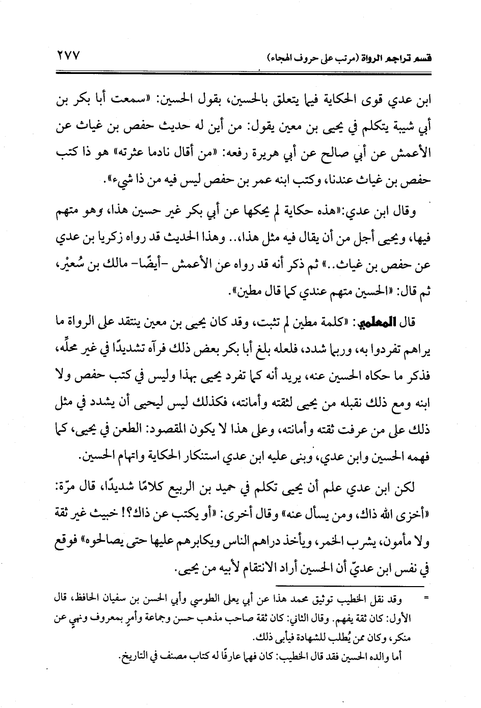 لكن ابن عدي علم أن يحيى تكلم في حميد بن الربيع كلامًا شديدًا، قال مرّة: "أخزى الله ذاك، ومن يسأل عنه" وقال أخرى: "أو يكتب عن ذاك؟! خبيث غير ثقة ولا مأمون، يشرب الخمر، ويأخذ دراهم الناس ويكابرهم عليها حتَّى يصالحوه" فوقع في نفس ابن عديّ أن الحسين أراد الانتقام لأبيه من يحيى.