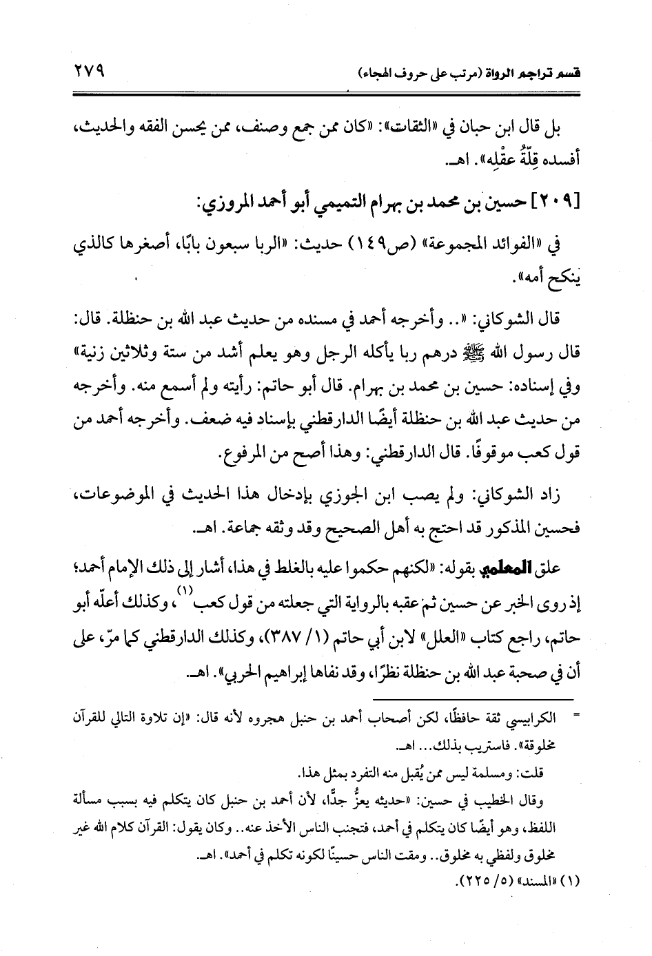 علق المعلمي بقوله: "لكنهم حكموا عليه بالغلط في هذا، أشار إلى ذلك الإِمام أحمد؛ إذ روى الخبر عن حسين ثم عقبة بالرواية التي جعلته من قول كعب (¬1)، وكذلك أعلّه أبو حاتم، راجع كتاب "العلل" لابن أبي حاتم (1/ 387)، وكذلك الدارقطني كما مرّ، على أن في صحبة عبد الله بن حنظلة نظرًا، وقد نفاها إبراهيم الحربي". اهـ