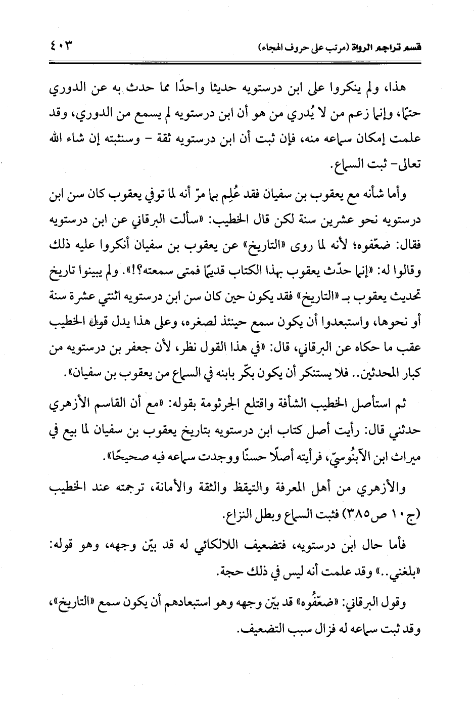 هذا، ولم ينكروا على ابن درستويه حديثا واحدًا مما حدث به عن الدوري حتمًا، وإنما زعم من لا يُدري من هو أن ابن درستويه لم يسمع من الدوري، وقد علمت إمكان سماعه منه، فإن ثبت أن ابن درستويه ثقة -وسنثبته إن شاء الله تعالى- ثبت السماع.