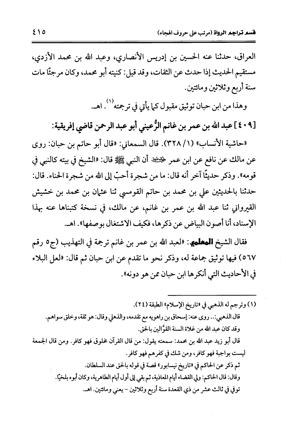 "حاشية الأنساب" (1/ 328). قال السمعاني: "قال أبو حاتم بن حبان: روى عن مالك عن نافع عن ابن عمر -رضي الله عنه- أن النبي -صلى الله عليه وسلم- قال: "الشيخ في بيته كالنبي في قومه". وذكر حديثًا آخر أنه قال: ما من شجرة أحبّ إلى الله من شجرة الحناء. قال: حدثنا بالحديثين علي بن محمد بن حاتم القومسي ثنا عثمان بن محمد بن خشيش القيرواني ثنا عبد الله بن عمر بن غانم، عن مالك، في نسخة كتبناها عنه بهذا الإسناد، أنا أصون البياض عن ذكرها، فكيف الاشتغال بوصفها". اهـ.
