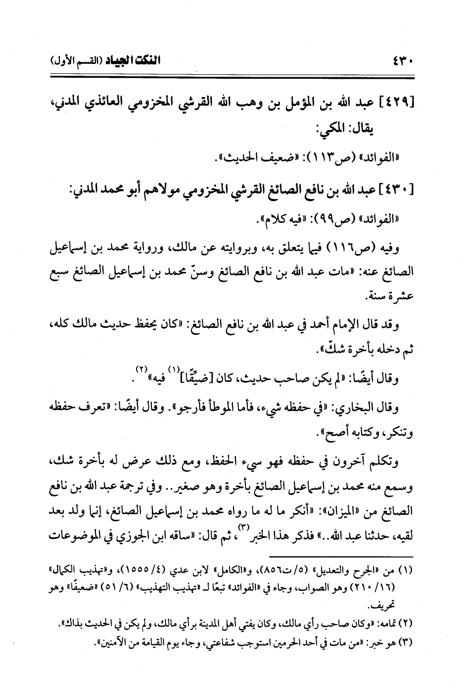 وفيه (ص 116) فيما يتعلق به، وبروايته عن مالك، ورواية محمد بن إسماعيل الصائغ عنه: "مات عبد الله بن نافع الصائغ وسنّ محمد بن إسماعيل الصائغ سبع عشرة سنة.