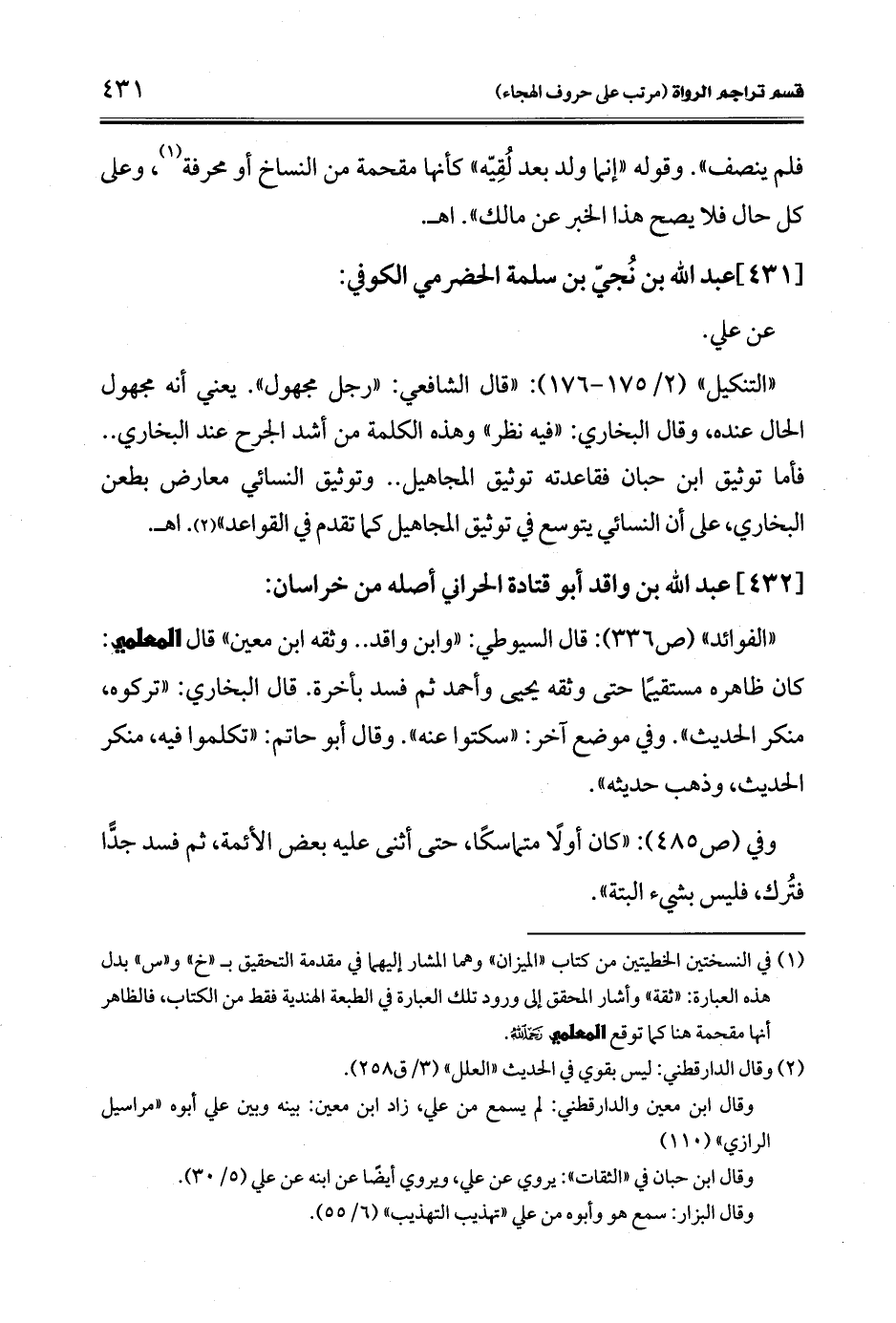 "التنكيل" (2/ 175 - 176): "قال الشافعي: "رجل مجهول". يعني أنه مجهول الحال عنده، وقال البخاري: "فيه نظر" وهذه الكلمة من أشد الجرح عند البخاري .. فأما توثيق ابن حبان فقاعدته توثيق المجاهيل .. وتوثيق النسائي معارض بطعن البخاري، على أن النسائي يتوسع في توثيق المجاهيل كما تقدم في القواعد" (¬2). اهـ.