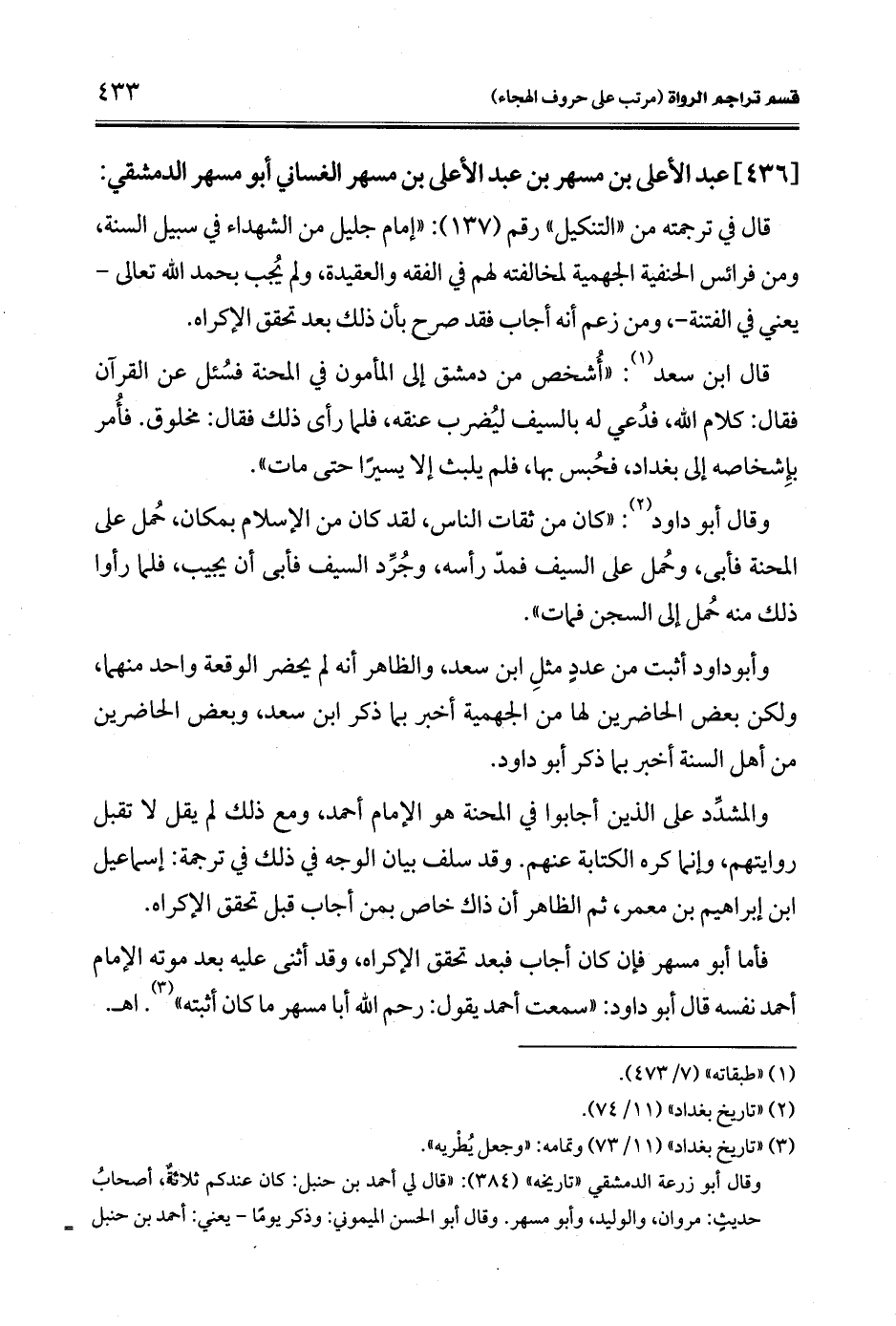 فأما أبو مسهر فإن كان أجاب فبعد تحقق الإكراه وقد أثنى عليه بعد موته الإمام أحمد نفسه قال أبو داود: "سمعت أحمد يقول: رحم الله أبا مسهر ما كان أثبته" (¬3). اهـ.