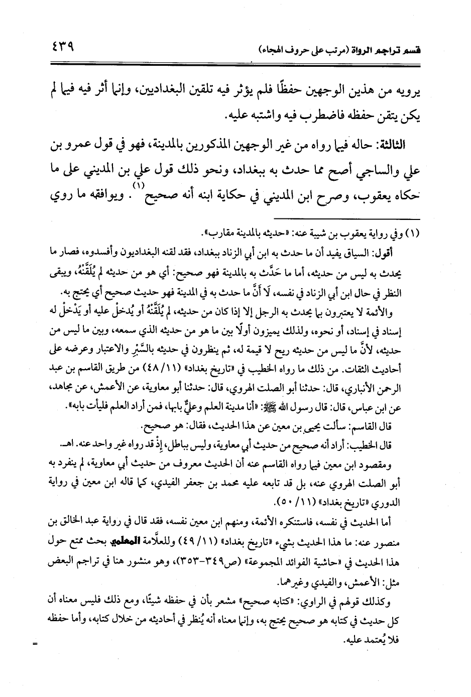 أقول: السياق يفيد أن ما حدث به ابن أبي الزناد ببغداد، فقد لقنه البغداديون وأفسدوه، فصار ما يحدث به ليس من حديثه أما ما حَدَّث به بالمدينة فهو صحيح: أي هو من حديثه لم يُلَقَّنْهُ، ويبقى النظر في حال ابن أبي الزناد في نفسه، لَا أَنَّ ما حدث به في المدينة فهو حديث صحيح أي يحتج به.