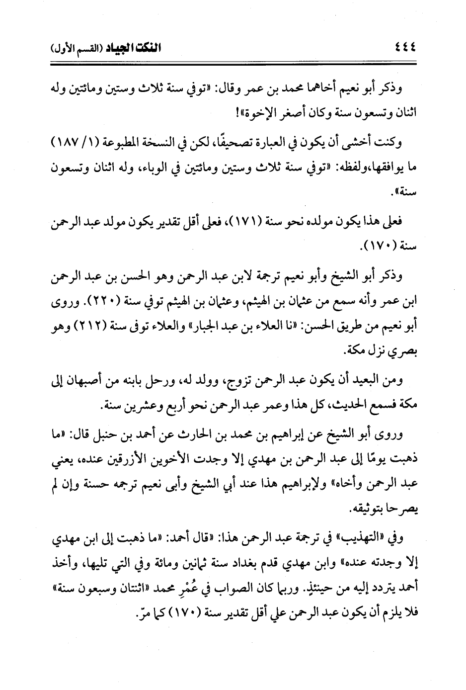 وفي "التهذيب" في ترجمة عبد الرحمن هذا: "قال أحمد: "ما ذهبت إلى ابن مهدي إلا وجدته عنده" وابن مهدي قدم بغداد سنة ثمانين ومائة وفي التي تليها، وأخذ أحمد يتردد إليه من حينئذٍ. وربما كان الصواب في عُمْرِ محمد "اثنتان وسبعون سنة" فلا يلزم أن يكون عبد الرحمن علي أقل تقدير سنة (170) كما مرّ.