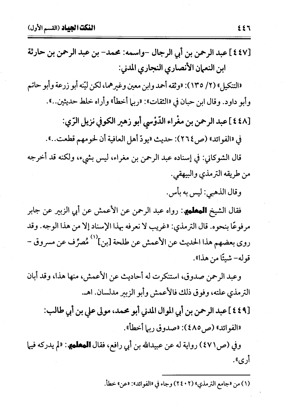 فقال الشيخ المعلمي: رواه عبد الرحمن عن الأعمش عن أبي الزبير عن جابر مرفوعًا بنحوه. قال الترمذي: "غريب لا نعرفه بهذا الإسناد إلا من هذا الوجه. وقد روى بعضهم هذا الحديث عن الأعمش عن طلحة [بن] (¬1) مُصرِّف عن مسروق -قوله- شيئًا من هذا".