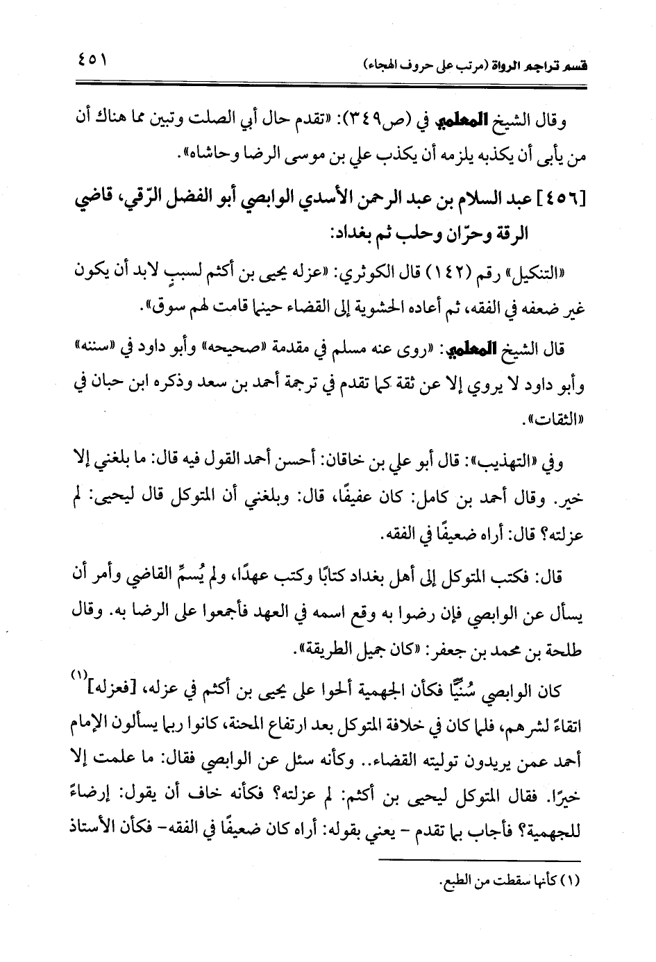 [456] عبد السلام بن عبد الرحمن الأسدي الوابصي أبو الفضل الرّقي، قاضي الرقة وحرّان وحلب ثم بغداد: