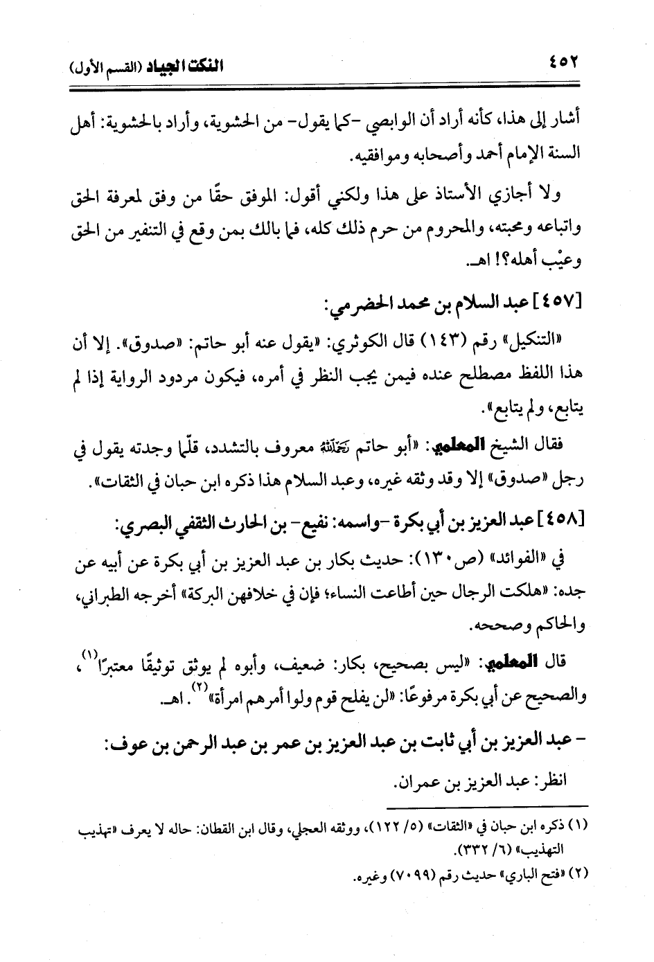 فقال الشيخ المعلمي: "أبو حاتم رحمه الله معروف بالتشدد، قلّما وجدته يقول في رجل "صدوق" إلا وقد وثقه غيره، وعبد السلام هذا ذكره ابن حبان في الثقات".