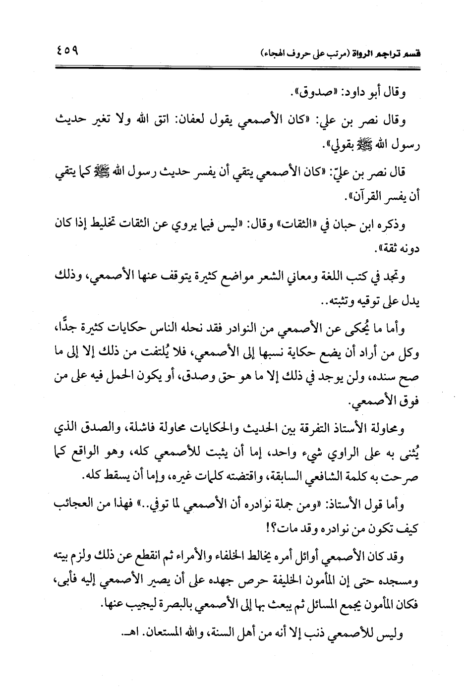 وليس للأصمعي ذنب إلا أنه من أهل السنة، والله المستعان. اهـ.