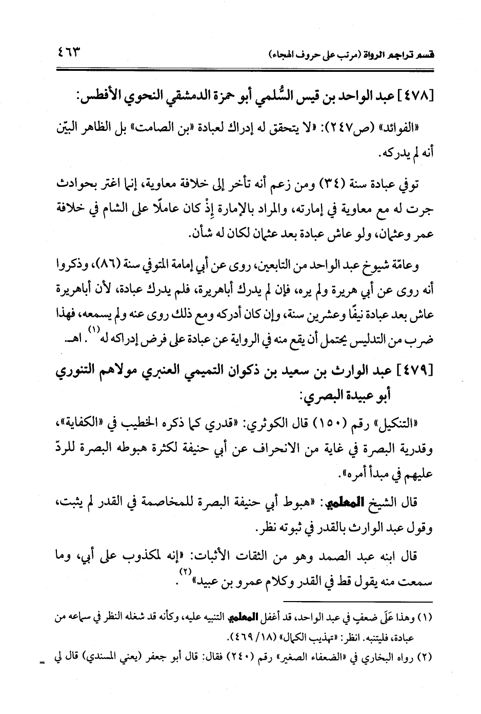 (¬1) وهذا عَلَى ضعفٍ في عبد الواحد، قد أغفل المعلمي التنبيه عليه، وكأنه قد شغله النظر في سماعه من عبادة، فليتنبه، انظر: "تهذيب الكمال" (18/ 469).