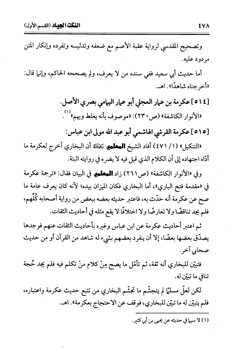 وفي "الأنوار الكاشفة" (ص 261) زاد المعلمي في البيان فقال: "ترجمة عكرمة في "مقدمة فتح الباري"، أما البخاري فكان الميزان بيده؛ لأنه كان يعرف عامة ما صح عن عكرمة أنه حدّث به، فاعتبر حديثه بعضه ببعض من رواية أصحابه كُلِّهم، فلم يجد تناقضًا ولا تعارضًا ولا اختلافًا لا يقع مثله في أحاديث الثقات.