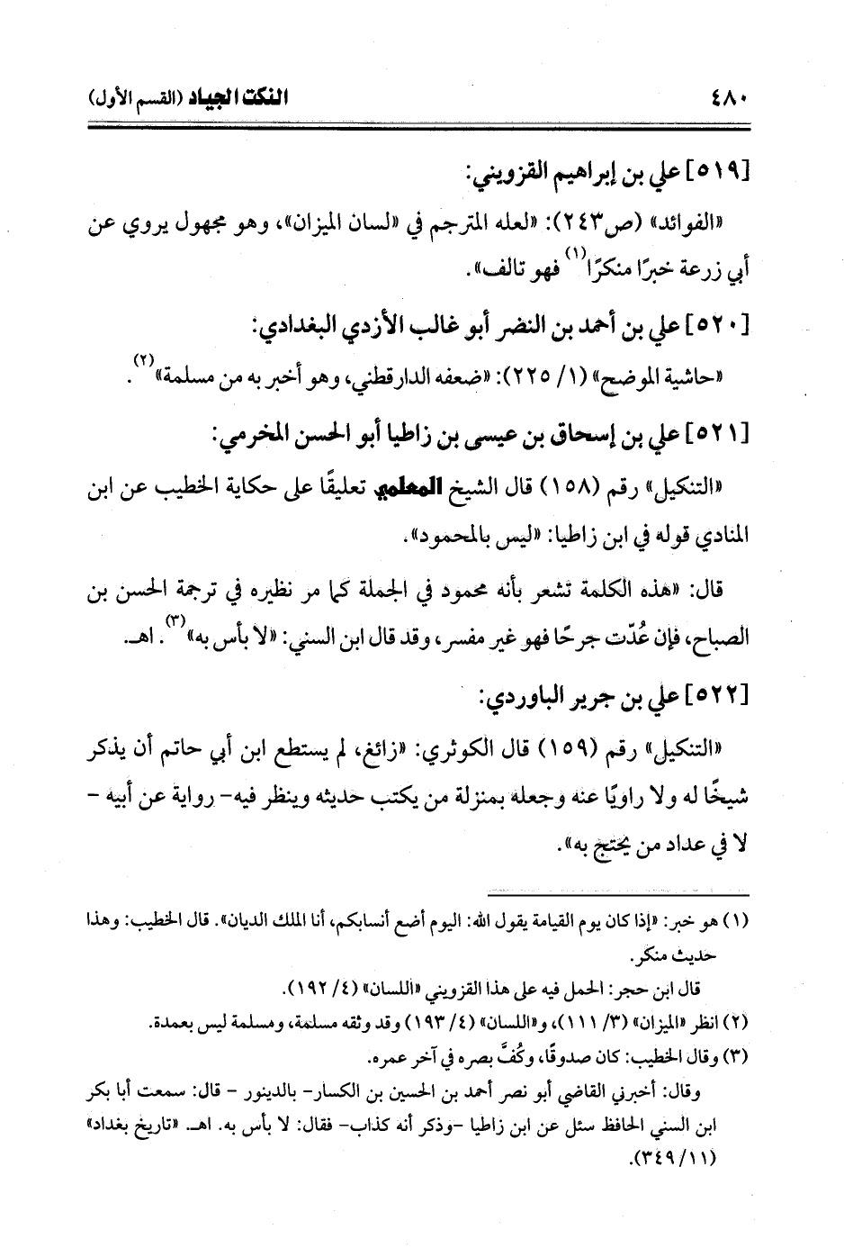 "التنكيل" رقم (158) قال الشيخ المعلمي تعليقًا على حكاية الخطيب عن ابن المنادي قوله في ابن زاطيا: "ليس بالمحمود".