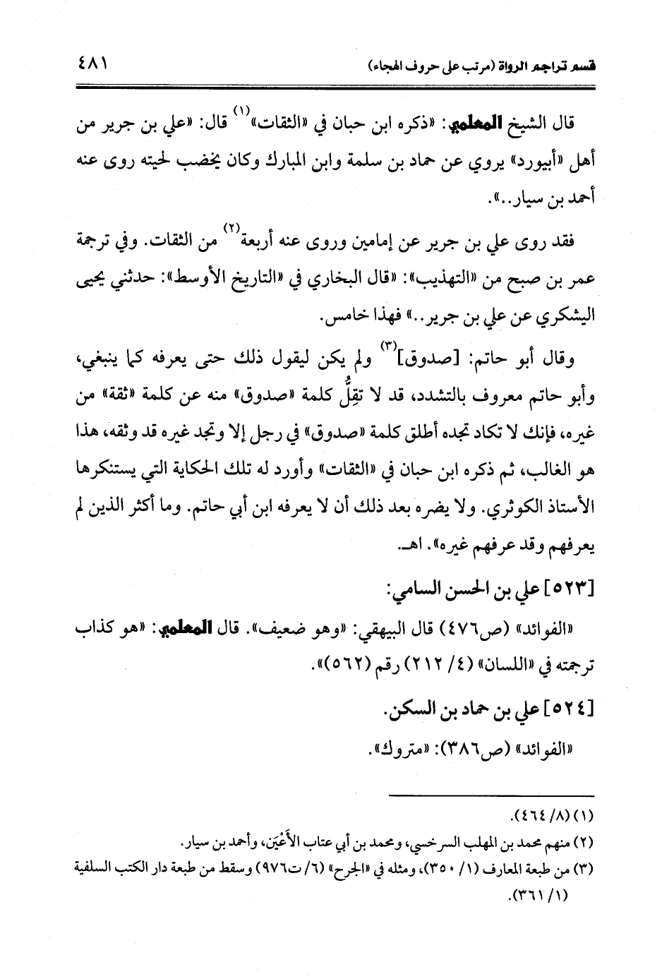 قال الشيخ المعلمي: "ذكره ابن حبان في "الثقات" (¬1) قال: "على بن جرير من أهل "أبيورد" يروي عن حماد بن سلمة وابن المبارك وكان يخضب لحيته روى عنه أحمد بن سيار .. ".