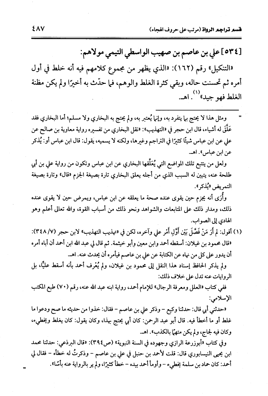 (¬1) أقول: لم أَرَ مَنْ فَضَّلَ بَيْن أَوَّلِ أَمْر علي وآخره، لكن في "تهذيب التهذيب" لابن حجر (7/ 348): "قال محمود بن غيلان: أسقطه أحمد وابن معين وأبو خيثمة. ثم قال لي عبد الله ابن أحمد أن أباه أمره أن يدور على كل من نهاه عن الكتابة عن علي بن عاصم فيأمره أن يحدث عنه. اهـ.