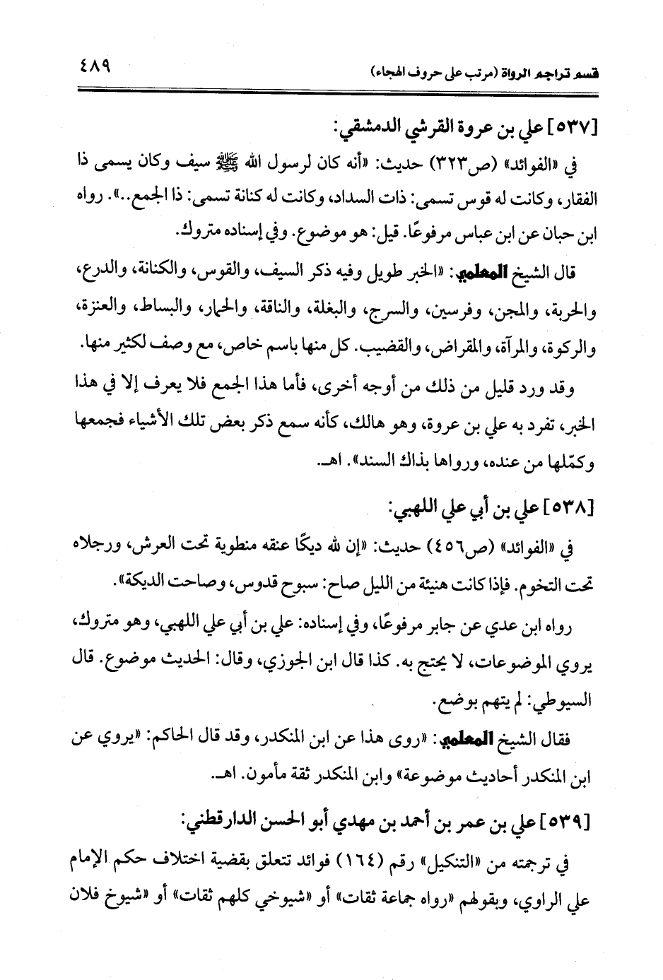 في ترجمته من "التنكيل" رقم (164) فوائد تتعلق بقضية اختلاف حكم الإمام علي الراوي، وبقولهم "رواه جماعة ثقات" أو"شيوخي كلهم ثقات" أو "شيوخ فلان