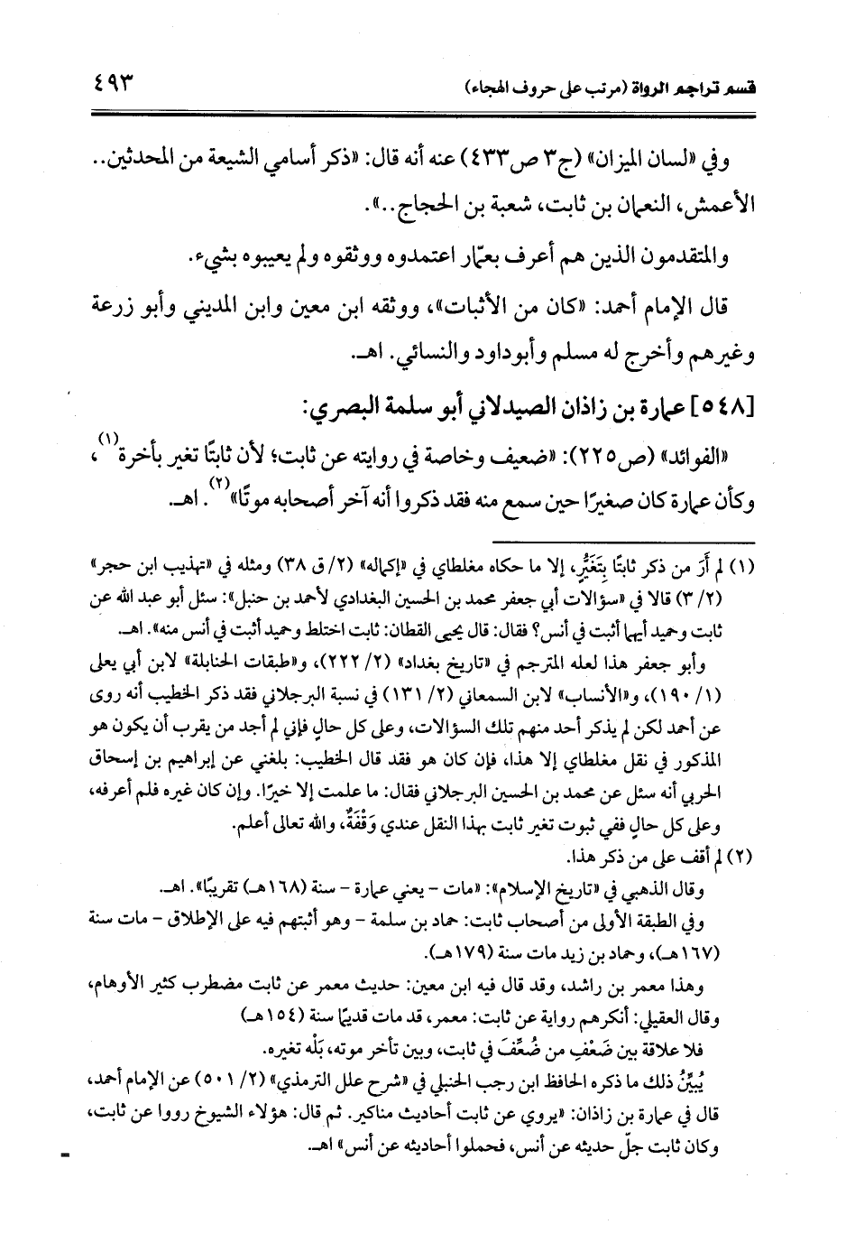 يُبيِّنُ ذلك ما ذكره الحافظ ابن رجب الحنبلي في "شرح علل الترمذي" (2/ 501) عن الإمام أحمد، قال في عمارة بن زاذان: "يروي عن ثابت أحاديث مناكير. ثم قال: هؤلاء الشيوخ رووا عن ثابت، وكان ثابت جلّ حديثه عن أنس، فحملوا أحاديثه عن أنس" اهـ. =
