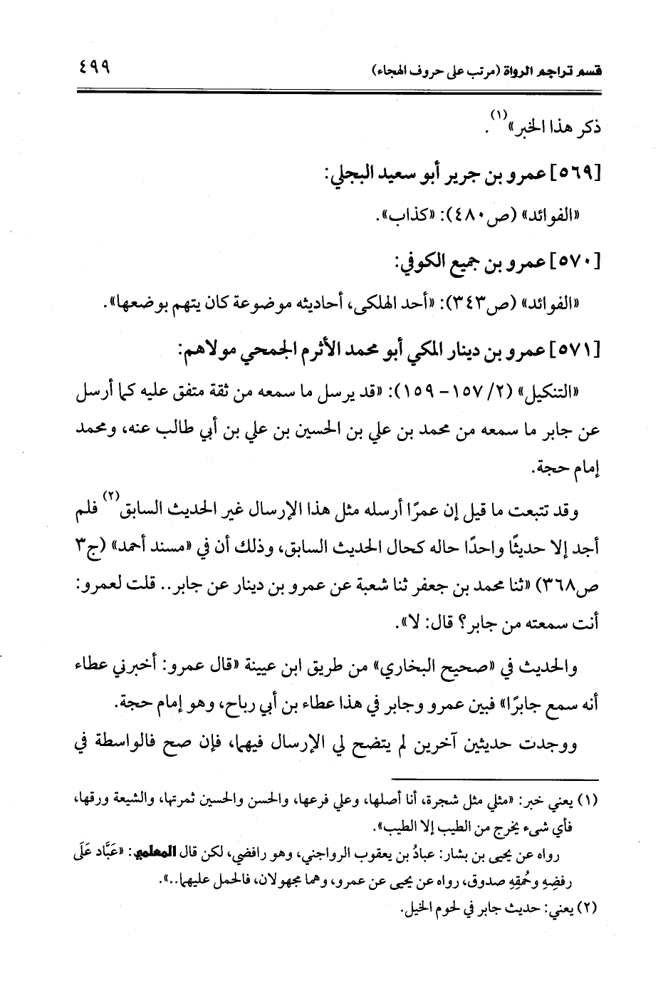 وقد تتبعت ما قيل إن عمرًا أرسله مثل هذا الإرسال غير الحديث السابق (¬2) فلم أجد إلا حديثًا واحدًا حاله كحال الحديث السابق، وذلك أن في "مسند أحمد" (ج 3 ص 368) "ثنا محمد بن جعفر ثنا شعبة عن عمرو بن دينار عن جابر .. قلت لعمرو: أنت سمعته من جابر؟ قال: لا".