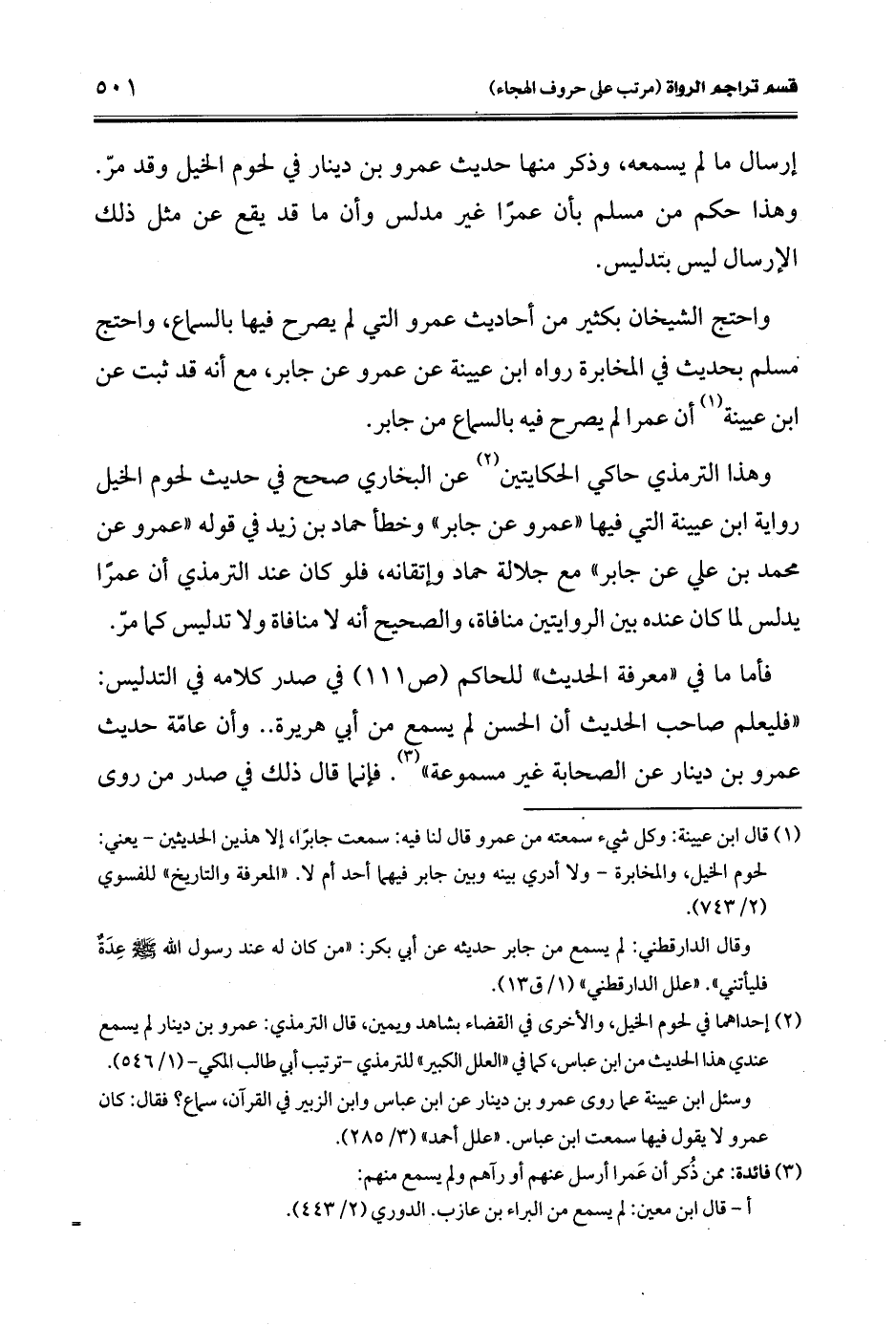 إرسال ما لم يسمعه، وذكر منها حديث عمرو بن دينار في لحوم الخيل وقد مرّ. وهذا حكم من مسلم بأن عمرًا غير مدلس وأن ما قد يقع عن مثل ذلك الإرسال ليس بتدليس.
