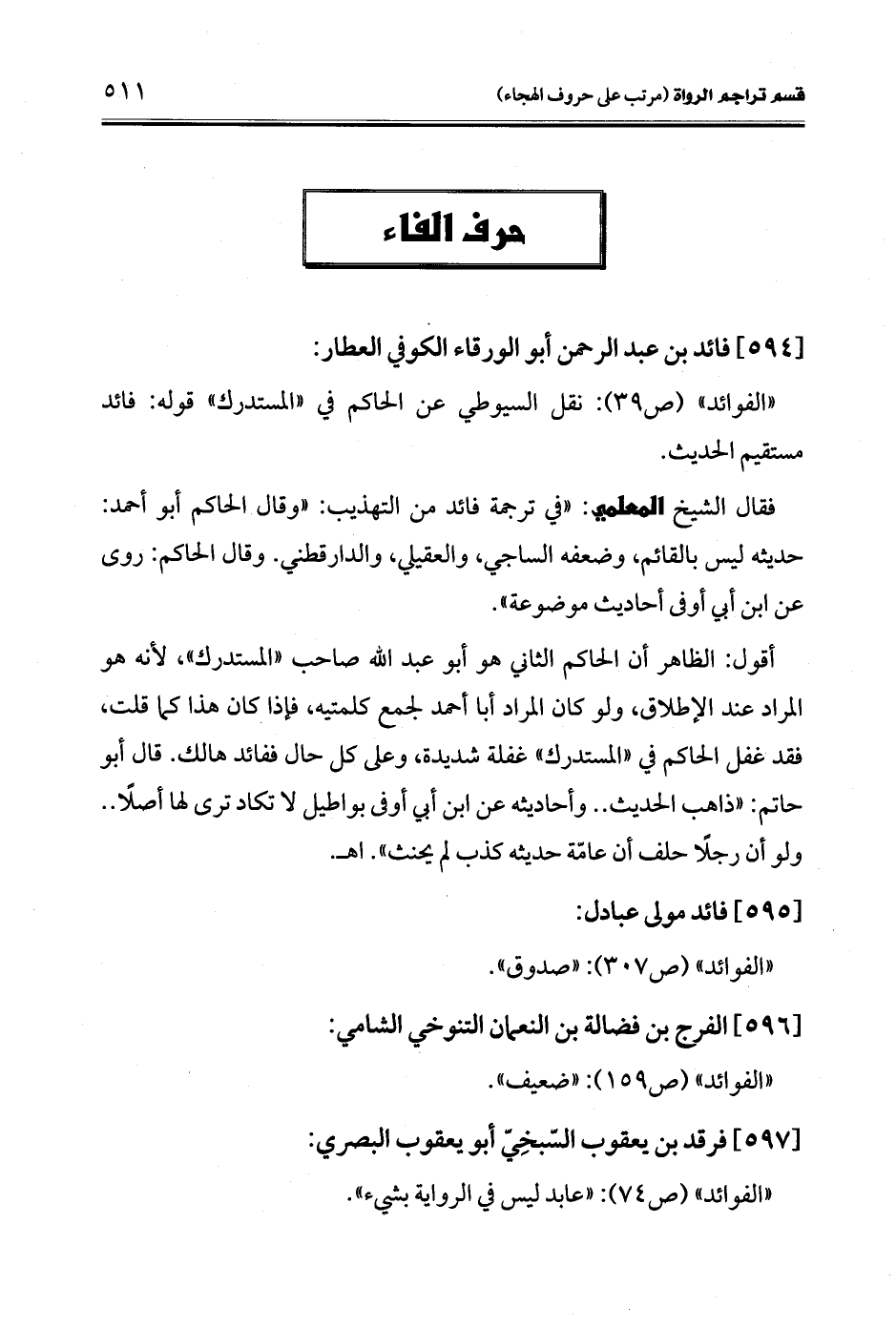 فقال الشيخ المعلمي: "في ترجمة فائد من التهذيب: "وقال الحاكم أبو أحمد: حديثه ليس بالقائم، وضعفه الساجي، والعقيلي، والدارقطني. وقال الحاكم: روى عن ابن أبي أوفى أحاديث موضوعة".