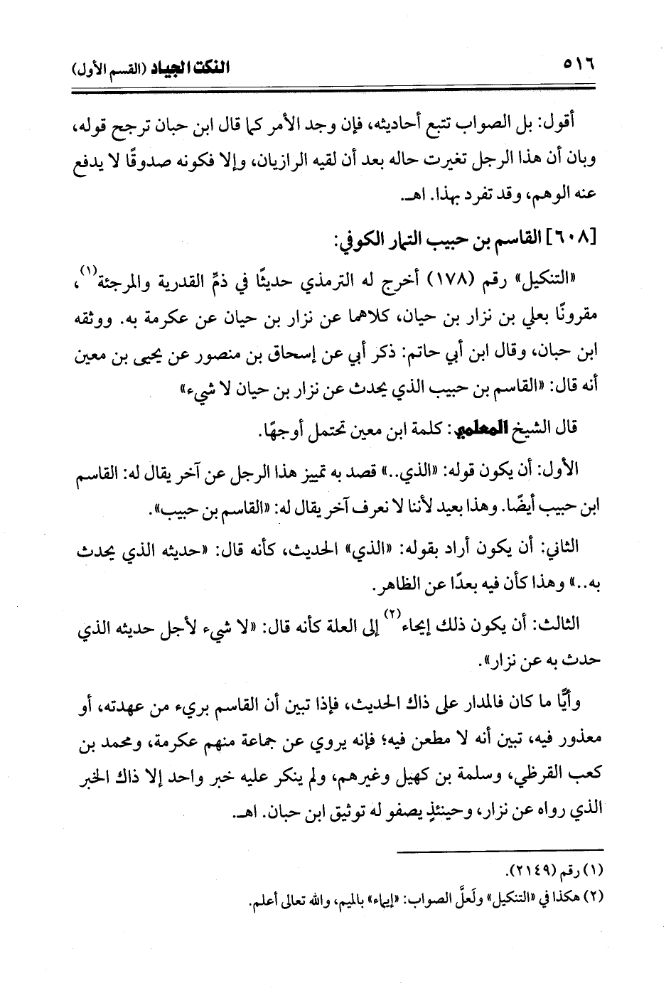 "التنكيل" رقم (178) أخرج له الترمذي حديثًا في ذمِّ القدرية والمرجئة (¬1)، مقرونًا بعلي بن نزار بن حيان، كلاهما عن نزار بن حيان عن عكرمة به. ووثقه ابن حبان، وقال ابن أبي حاتم: ذكر أبي عن إسحاق بن منصور عن يحيى بن معين أنه قال: "القاسم بن حبيب الذي يحدث عن نزار بن حيان لا شيء".