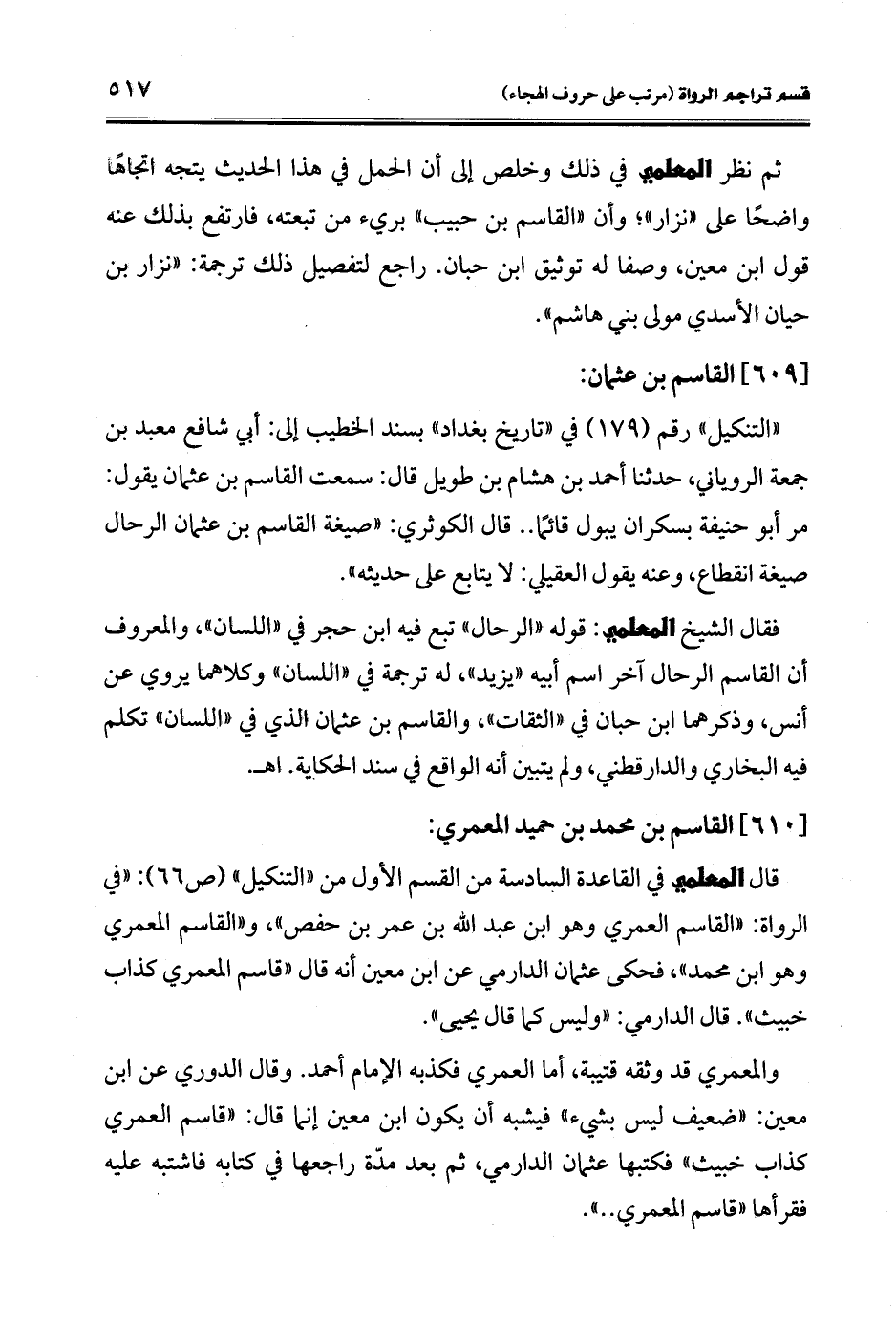 قال المعلمي في القاعدة السادسة من القسم الأول من "التنكيل" (ص 66): "في الرواة: "القاسم العمري وهو ابن عبد الله بن عمر بن حفص"، و"القاسم المعمري وهو ابن محمد"، فحكى عثمان الدارمي عن ابن معين أنه قال "قاسم المعمري كذاب خبيث". قال الدارمي: "وليس كما قال يحيى".