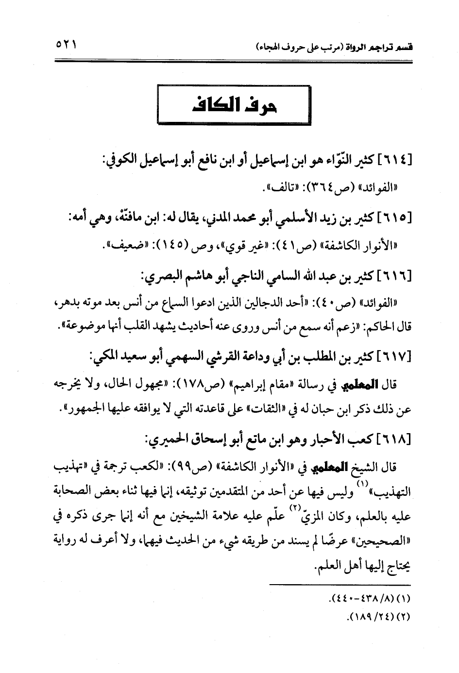 قال الشيخ المعلمي في "الأنوار الكاشفة" (ص 99): "لكعب ترجمة في "تهذيب التهذيب" (¬1) وليس فيها عن أحد من المتقدمين توثيقه، إنما فيها ثناء بعض الصحابة عليه بالعلم، وكان المزيّ (¬2) علّم عليه علامة الشيخين مع أنه إنما جرى ذكره في "الصحيحين" عرضًا لم يسند من طريقه شيء من الحديث فيهما، ولا أعرف له رواية يحتاج إليها أهل العلم.