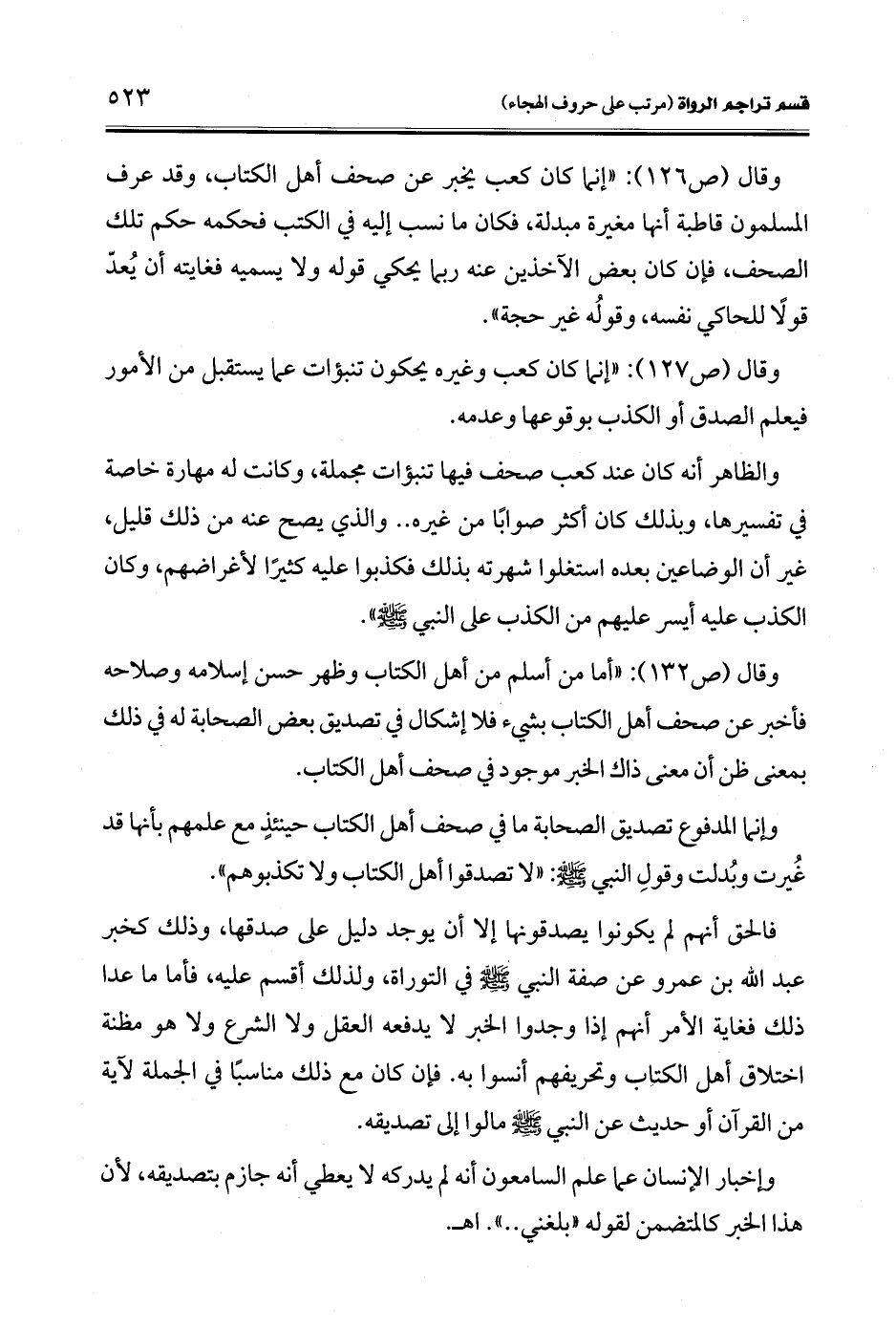 وقال (ص 126): "إنما كان كعب يخبر عن صحف أهل الكتاب، وقد عرف المسلمون قاطبة أنها مغيرة مبدلة، فكان ما نسب إليه في الكتب فحكمه حكم تلك الصحف، فإن كان بعض الآخذين عنه ربما يحكي قوله ولا يسميه فغايته أن يُعدّ قولًا للحاكي نفسه، وقولُه غير حجة".
