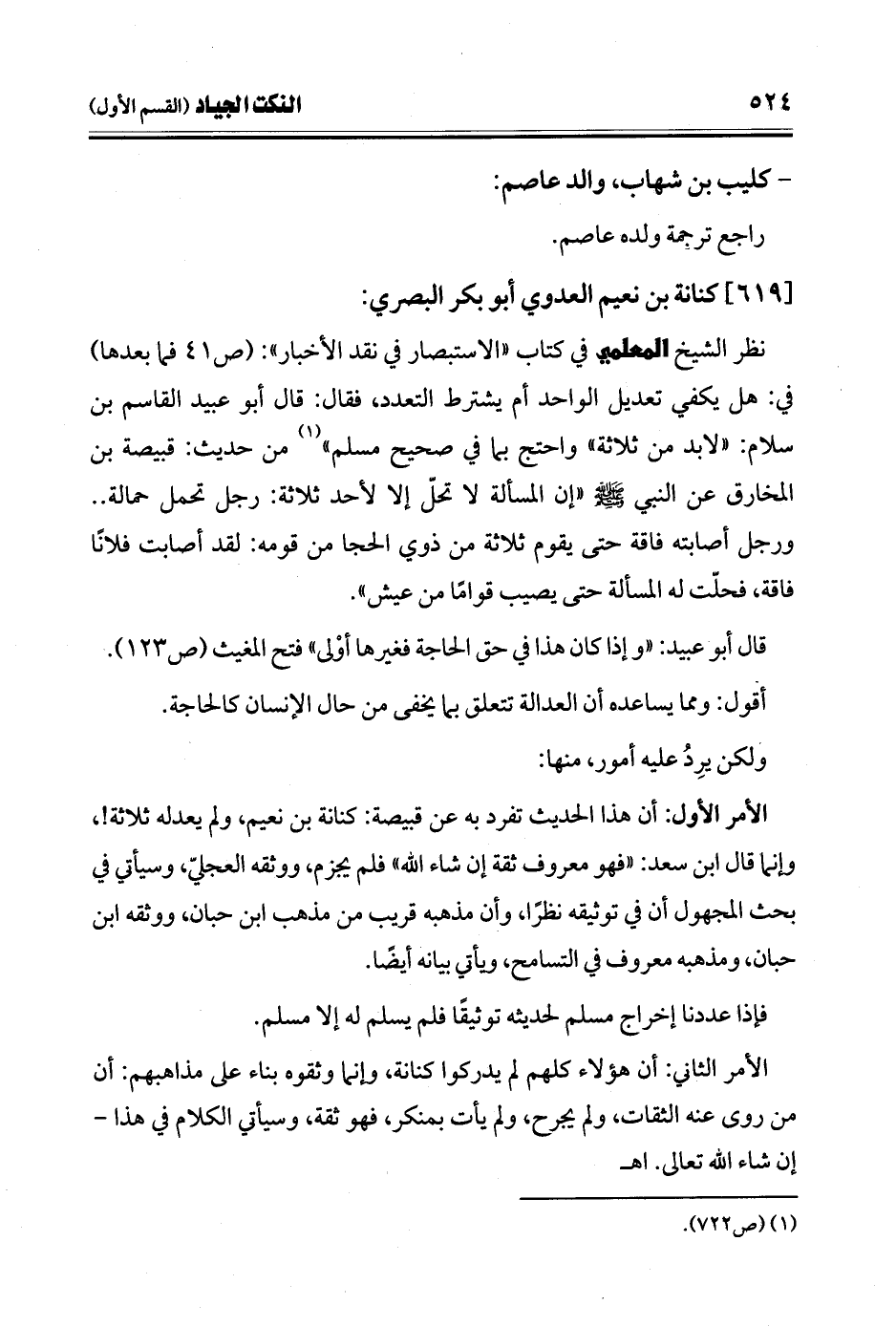 نظر الشيخ المعلمي في كتاب "الاستبصار في نقد الأخبار": (ص 41 فما بعدها) في: هل يكفي تعديل الواحد أم يشترط التعدد، فقال: قال أبو عبيد القاسم بن سلام: "لابد من ثلاثة" واحتج بما في صحيح مسلم" (¬1) من حديث: قبيصة بن المخارق عن النبي -صلى الله عليه وسلم- "إن المسألة لا تحلّ إلا لأحد ثلاثة: رجل تحمل حمالة .. ورجل أصابته فاقة حتى يقوم ثلاثة من ذوي الحجا من قومه: لقد أصابت فلانًا فاقة، فحلّت له المسألة حتى يصيب قوامًا من عيش".
