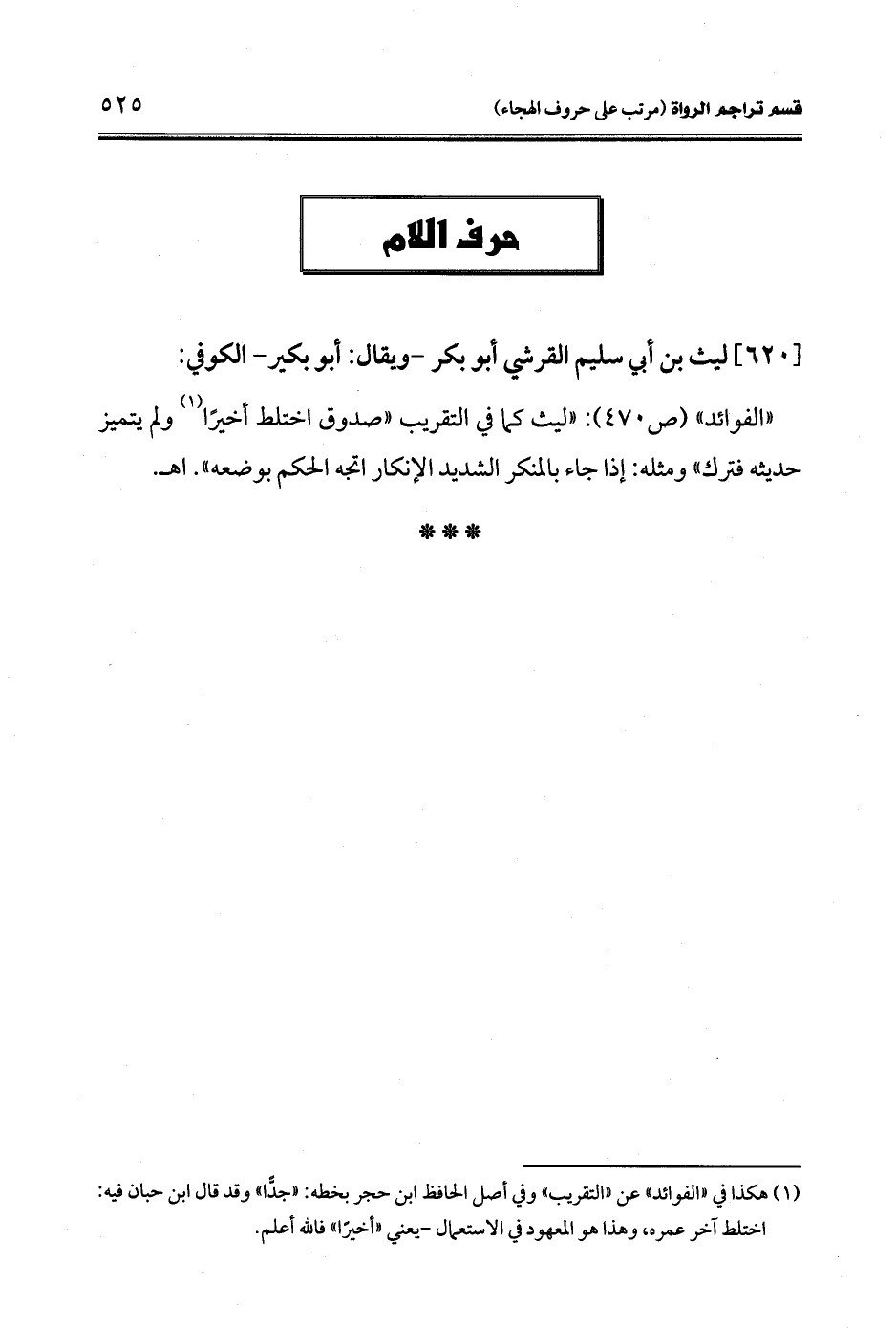 "الفوائد" (ص 470): "ليث كما في التقريب "صدوق اختلط أخيرًا (¬1) ولم يتميز حديثه فترك" ومثله: إذا جاء بالمنكر الشديد الإنكار اتجه الحكم بوضعه". اهـ.