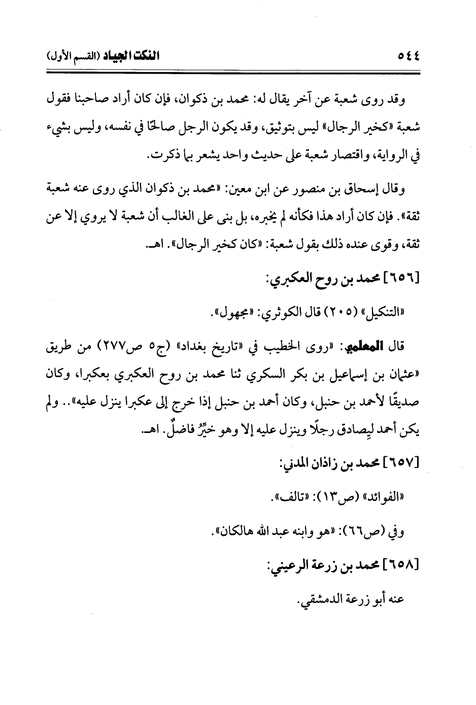 وقال إسحاق بن منصور عن ابن معين: "محمد بن ذكوان الذي روى عنه شعبة ثقة". فإن كان أراد هذا فكأنه لم يخبره، بل بنى على الغالب أن شعبة لا يروي إلا عن ثقة، وقوى عنده ذلك بقول شعبة: "كان كخير الرجال". اهـ.