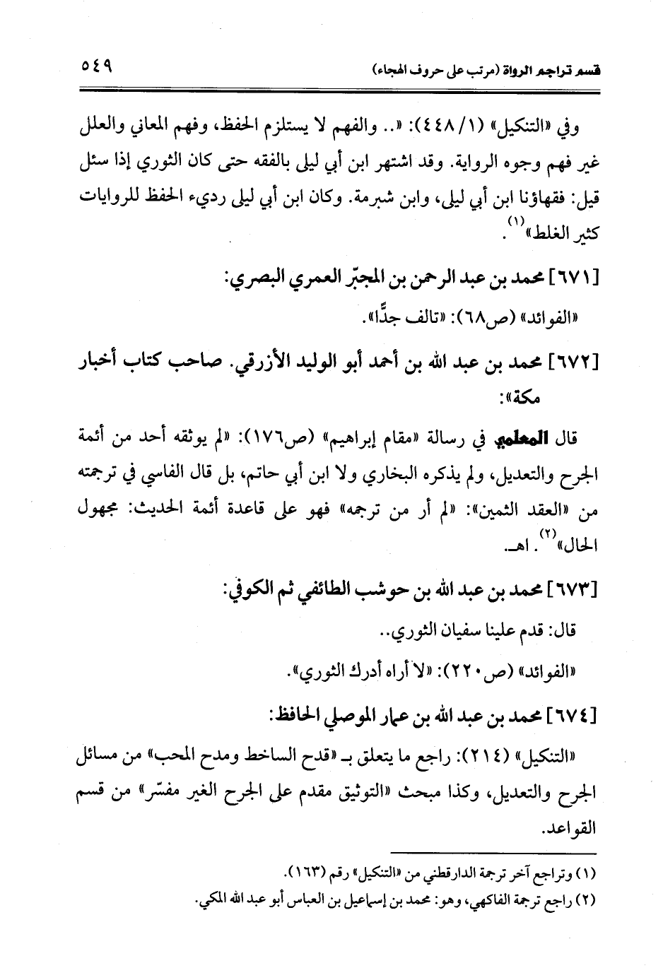 "التنكيل" (214): راجع ما يتعلق بـ "قدح الساخط ومدح المحب" من مسائل الجرح والتعديل، وكذا مبحث "التوثيق مقدم على الجرح الغير مفسّر" من قسم القواعد.