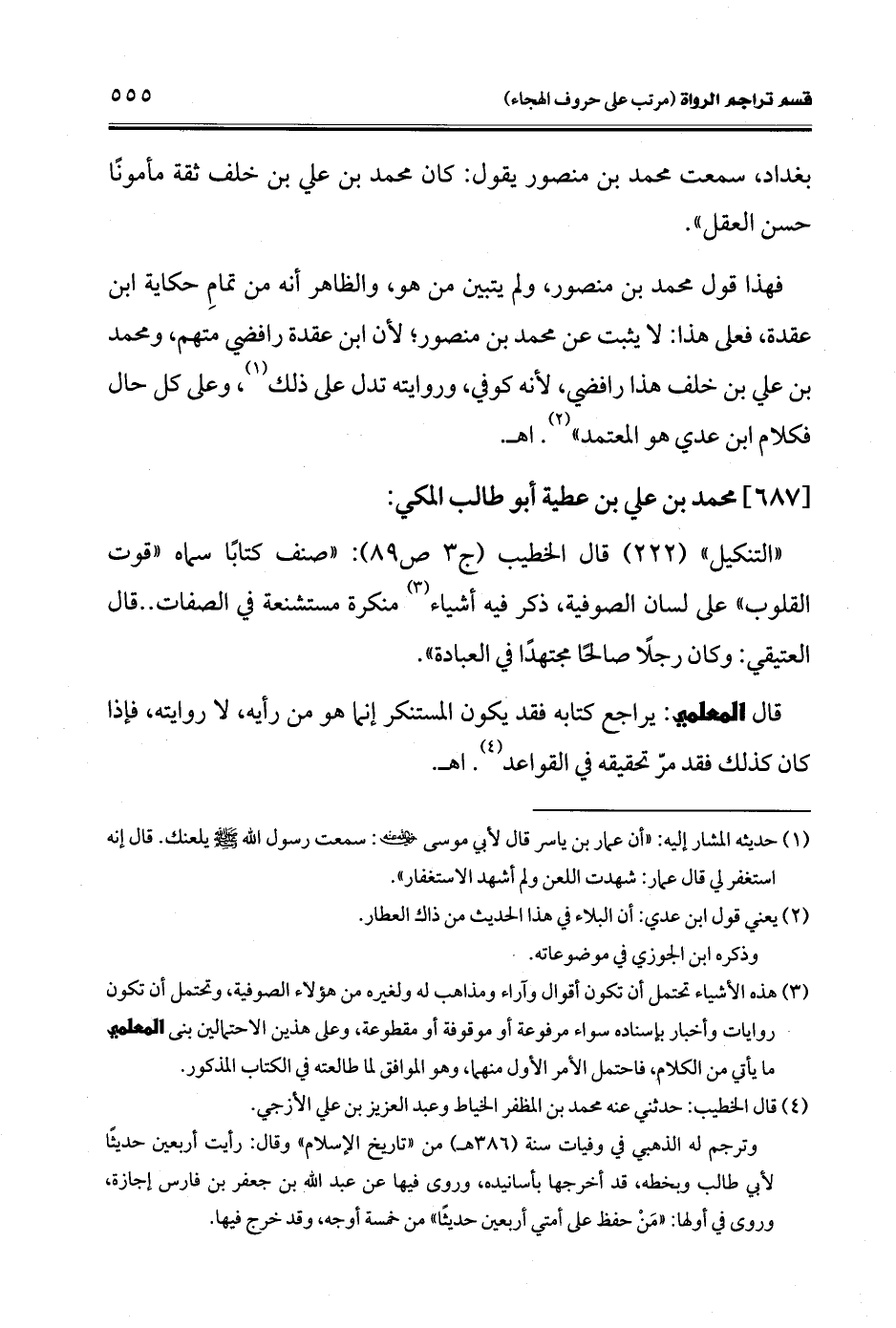 "التنكيل" (222) قال الخطيب (ج 3 ص 89): "صنف كتابًا سماه "قوت القلوب" على لسان الصوفية، ذكر فيه أشياء (¬3) منكرة مستشنعة في الصفات .. قال العتيقي: وكان رجلًا صالحًا مجتهدًا في العبادة".