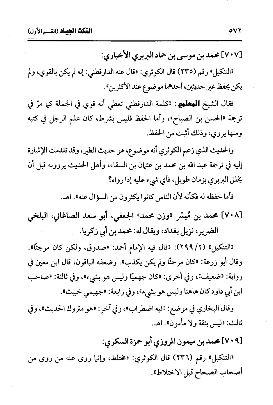 فقال الشيخ المعلمي: "كلمة الدارقطني تعطي أنه قوي في الجملة كما مرّ في ترجمة "الحسن بن الصباح"، وأما الحفظ فليس بشرط، كان علم الرجل في كتبه ومنها يروي، وذلك أثبت من الحفظ.