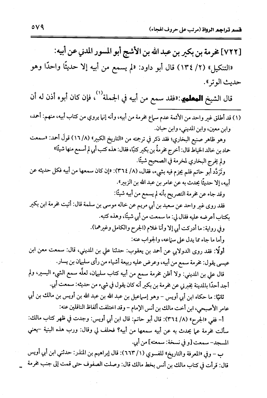 (¬1) قد أطلق غير واحد من الأئمة عدم سماع مخرمة من أبيه وأنه إنما يروي من كتاب أبيه منهم: أحمد، وابن معين، وابن المديني، وابن حبان.