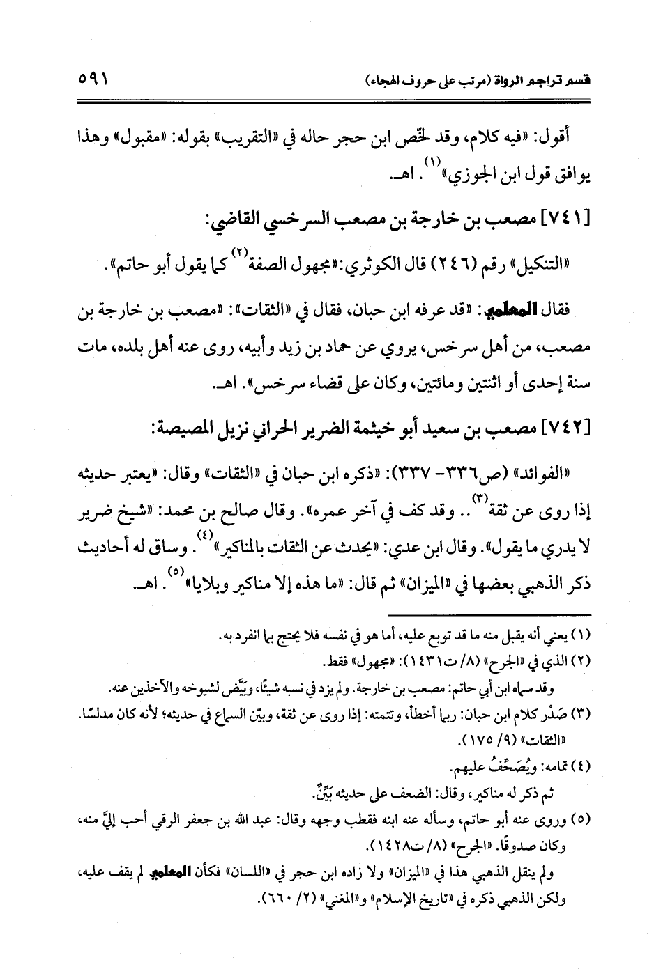 فقال المعلمي: "قد عرفه ابن حبان، فقال في "الثقات": "مصعب بن خارجة بن مصعب، من أهل سرخس، يروي عن حماد بن زيد وأبيه روى عنه أهل بلده، مات سنة إحدى أو اثنتين ومائتين، وكان على قضاء سرخس". اهـ.